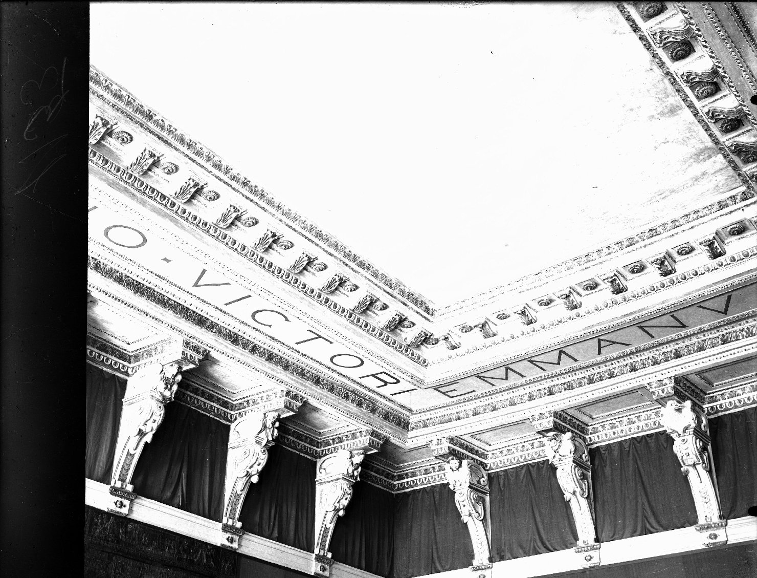 - NOTIZIE STORICO CRITICHE La lastra, pubblicata sul Bollettino d'Arte nel 1927, mostra un dettaglio del soffitto del Salone degli Arcieri dopo il restauro intrapreso nel 1925 (Clinio Cottafavi, R. Palazzo Ducale di Mantova. Il Salone degli Arcieri, "Bollettino d'arte del Ministero della pubblica istruzione", serie II, vol. VII, n. 4 (ottobre), 1927, pp. 235-240: fig. 4). Prima degli interventi del Ventennio, del lacunare del soffitto di questa sala non restava che la soprastante armatura in legname, essendosi persa nel corso del secondo Ottocento la specchiatura centrale in cannicciato. Si notano qui chiaramente le mensole, le cornici e le modanature in stucco di Antonio Maria Viani, architetto di Vincenzo I Gonzaga e responsabile delle trasformazioni architettoniche e decorative di questa zona della reggia. Si vede anche l'unica arpia che sia stata interamente ricostruita (quella con testa d'aquila all'estrema destra sotto la N della dedica al re che corre nella fascia esterna del soffitto). Tra le mensole e alle pareti si notano tendaggi in tessuto, a coprire la decorazione originaria della sala (con cavalli nascosti da tendaggi color ocra) portata in luce in parte nel corso del restauro, ma qui ancora tagliata dalla cornice alla base dei mensoloni, che sarà rimossa solo negli anni Sessanta del secolo insieme ai trompe l'oeil neoclassici alle pareti (Renato Berzaghi, Il Palazzo Ducale di Mantova, Milano, Electa, 1992, pp. 42-43)