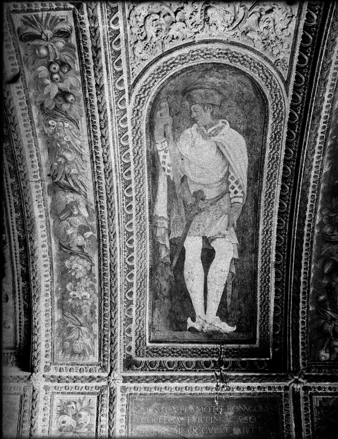- NOTIZIE STORICO CRITICHE La lastra fotografa una delle otto nicchie dipinte a olio su intonaco da Lorenzo Costa il Giovane sulla volta della Sala della Mostra, detta anche Loggia dei Frutti, nel cosiddetto Appartamento dell'Estivale situato nella Palazzina della Rustica. Progettata da Giulio Romano nel 1539 per Federico II Gonzaga, ma conclusa nella definizione architettonica e nell'apparato decorativo solo nel 1561, durante il ducato del figlio Guglielmo, la Rustica fu occupata sino al 1897 dall'Esercito che del salone in questione fece un deposito di biade per i cavalli dell'adiacente Caserma Gonzaga (allocata nelle ex scuderie ducali). Lo scatto risulta pubblicato nel 1927 in forma anonima nella relazione del restauro (1925-1927) stilata da Cottafavi (Clinio Cottafavi, R. Palazzo Ducale di Mantova. Loggia dei frutti, "Bollettino d'arte del Ministero della pubblica istruzione", serie II, vol. VI, n. 9 (marzo), 1927, pp. 421-428, fig. 4) con la didascalia "Nicchia con Pinamonte Bonacolsi". Poiché nell'anno successivo alla pubblicazione sul Bollettino Romolo Quazza utilizzò alcune delle lastre che lo illustravano ascrivendole a Nino Giannantoni, non pare illecito attribuire al medesimo artefice questo come gli altri negativi della campagna fotografica che fu condotta intorno al 1927 nella restaurata Loggia dei Frutti (Romolo Quazza, Devastazioni e restauri nel Palazzo Ducale di Mantova, "Emporium", vol. 67, n. 399 (marzo), 1928, pp. 153, 154, 156). Il tema iconografico della volta del salone, attribuito a Giovanni Battista Bertani, riguarda l'Edificazione di Mantova dalla fondazione mitologica alla costruzione delle porte cittadine. L'autore delle scene dipinte è stato identificato in Lorenzo Costa il Giovane, mentre per i festoni di frutti si riscontra la stessa mano anonima che, su disegno dell'architetto Bertani, dipinge anche i trofei ittici della vicina Sala del Pesce (Renato Berzaghi, Le decorazioni dalla metà del Cinquecento alla caduta dei Gonzaga, in Il Palazzo Ducale di Mantova, a cura di G. Algeri, Mantova 2003, pp. 223-228)