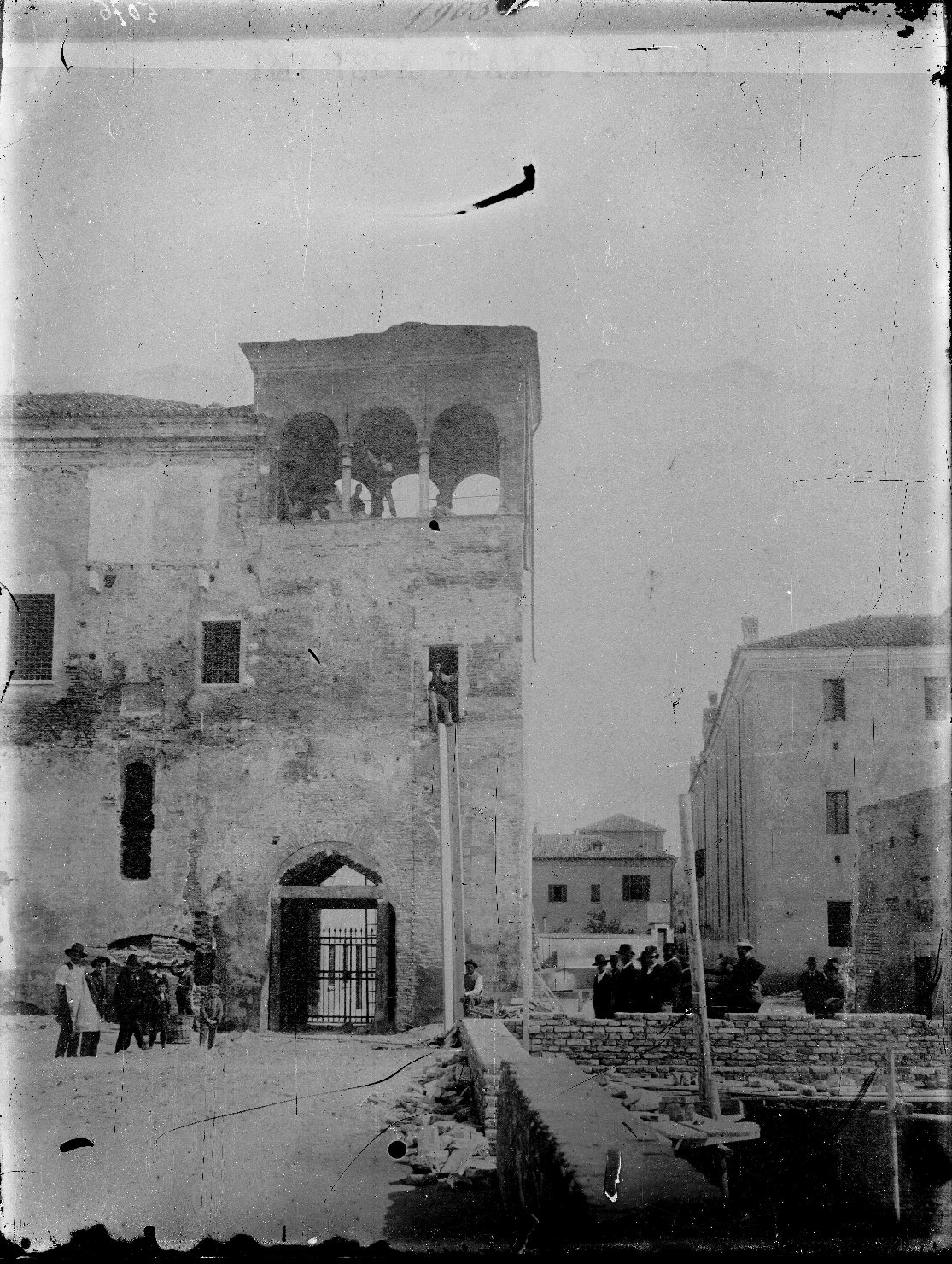 - NOTIZIE STORICO CRITICHE Nel positivo originale, in alto è manoscritta la data 1903 e al di sotto si intravede un timbro con la dicitura "Ripresa Italo Pavesi". A partire dal 1901, in seguito alla volontà di modificare la viabilità urbanistica della città, a Mantova si intraprende un "programma sistematico di demolizione delle porte e delle mura" (Grimoldi 2003). L'immagine in esame raffigura la torre di Porta Pusterla, abbattuta nel 1903, i cui laterizi verranno richiesti per il restauro della facciata del Palazzo del Capitano