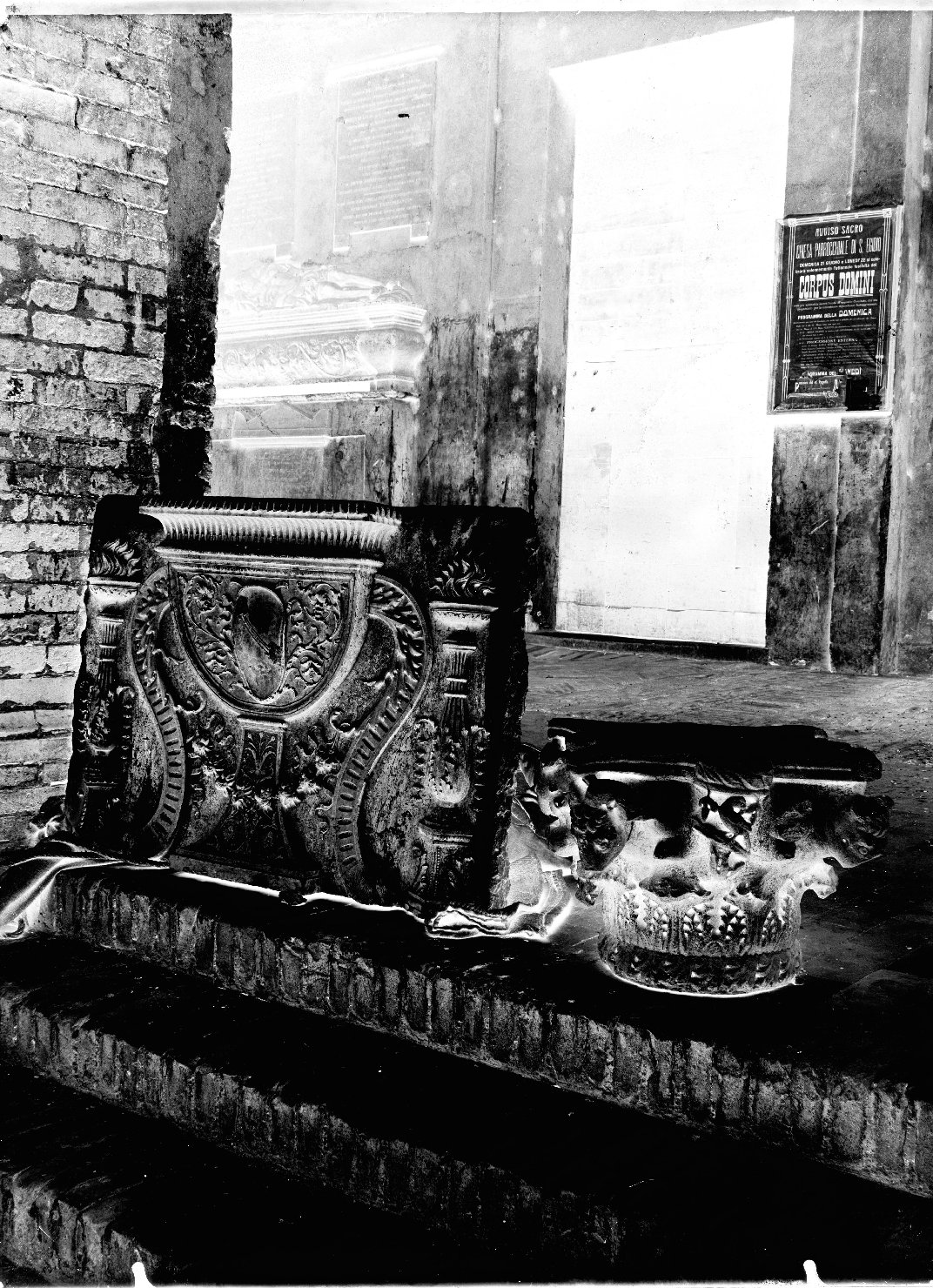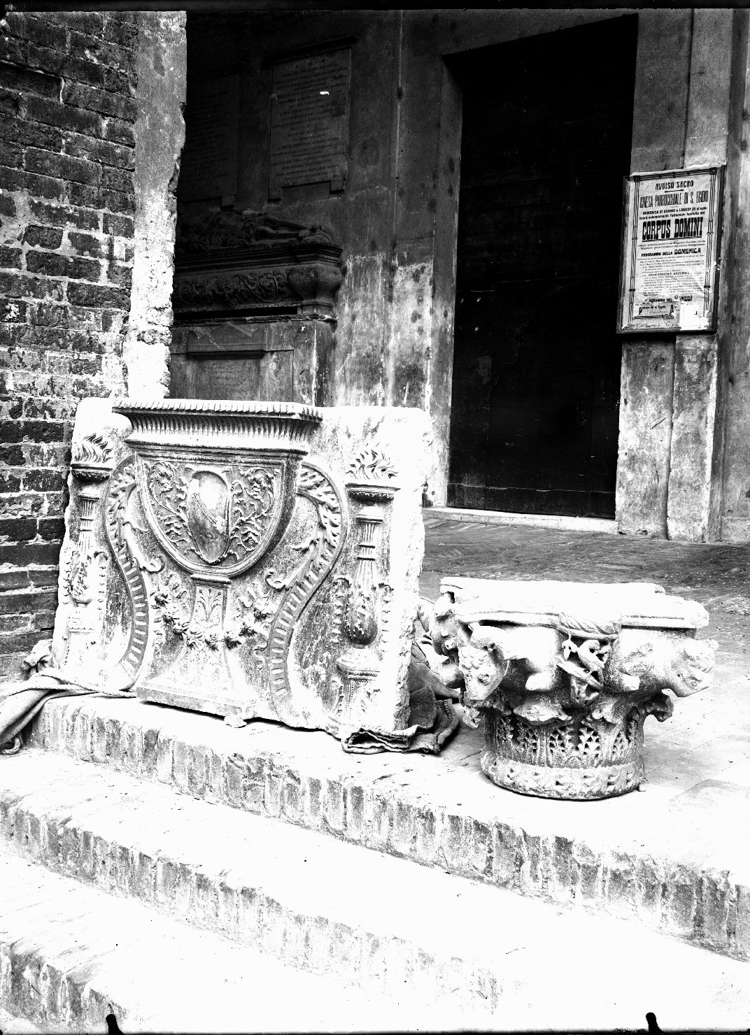 - NOTIZIE STORICO CRITICHE Questa serie di scatti documenta reperti architettonici (in massima parte lo stesso capitello zoomorfo e alcune lastre a rilievo), posti sulla scalinata esterna del protiro settentrionale. Dall'analisi morfologica del negativo si può circoscrivere un arco cronologico tra gli anni '20 e gli anni '40 del Novecento. Probabilmente si tratta dei capitelli provenienti dalla facciata della Basilica, in pietra gallina, che coronavano le lesene dell’arco trionfale del nartece, attribuite a Luca Fancelli, ora conservati presso il Museo della Città in Palazzo S. Sebastiano, a Mantova, nella sezione "la città del principe"