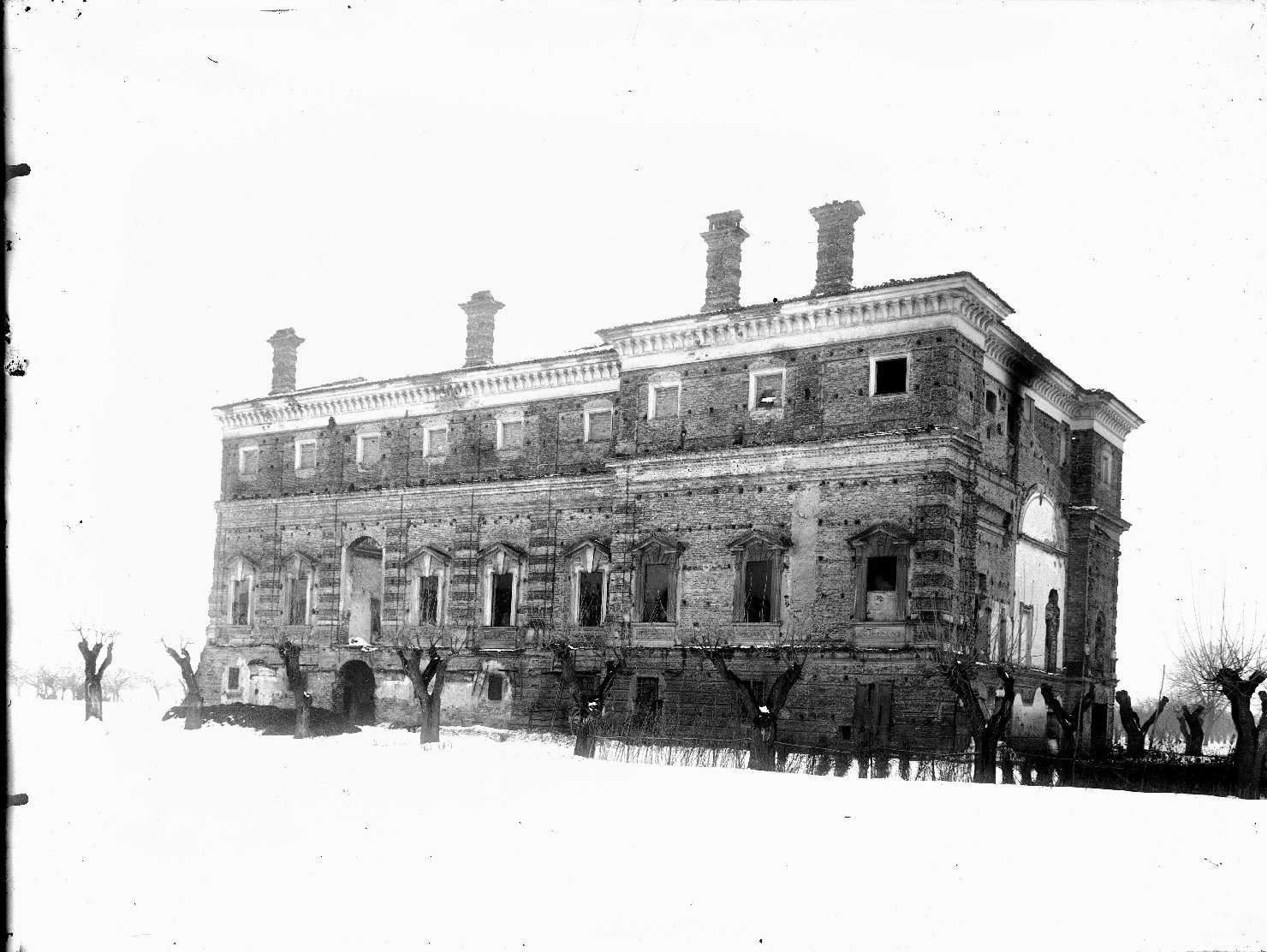 - NOTIZIE STORICO CRITICHE La villa La Favorita viene dichiarata monumento nazionale nell'ottobre 1913. Purtroppo le sue travagliate vicende conservative la mostrano ancora oggi in pessime condizioni. Nell'archivio cartaceo della Soprintendenza architettonica di Brescia sono presenti diversi carteggi e documenti che si riferiscono alla necessità di restauri. Già nel 1921 il Sottosegretario di Stato segnala al soprintendente ai Monumenti di Venezia la mancanza assoluta di ogni documentazione descrittiva, grafica e topografica dell'importanza storia e artistica della villa e delle sue condizioni. Nel 1926, l'Ispettore Onorario ai Monumenti, ing. Schiavi, segnala che dopo un rovinoso temporale l'attico risulta sfondato con gravi danni ai piani sottostanti. Si sostiene necessario un intervento di restauro urgente, per i quali occorrerebbe "una settimana o più di rilievi grafici e fotografici". L'immagine in esame mostra la parte posteriore della villa e fa parte di una serie di quattro in cui il solaio risulta già crollato. La presenza della neve colloca lo scatto nella stagione invernale ma non ci sono altri elementi per circoscrivere meglio l'occasione della ripresa