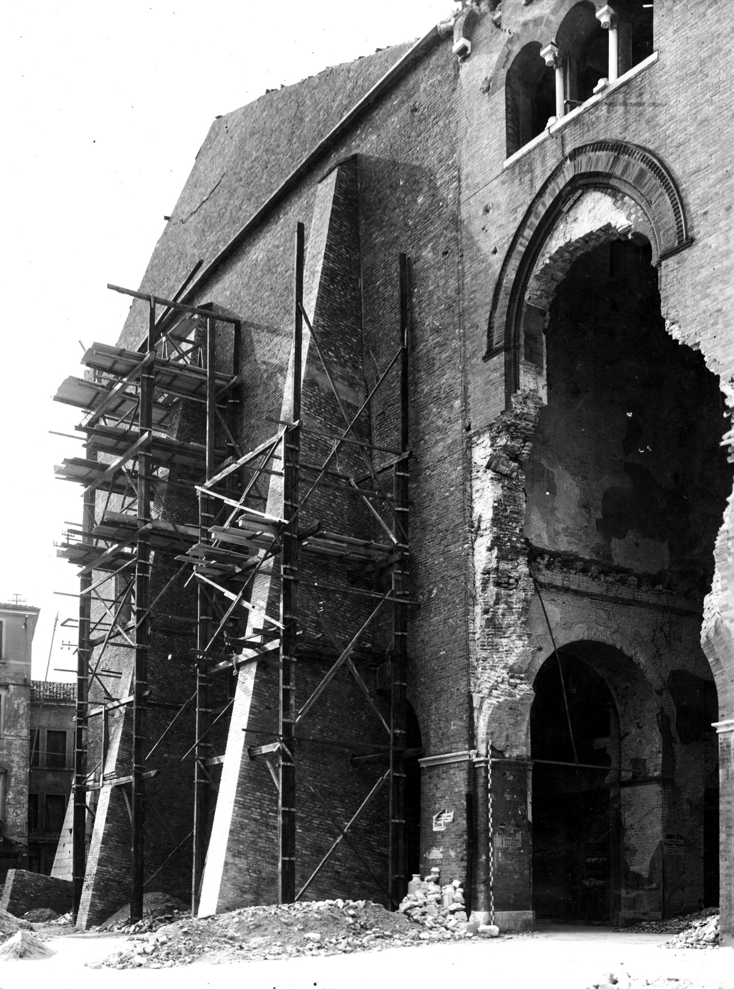 Palazzo dei Trecento. Salone dei Trecento. La costruzione dei contrafforti. lato piazza del Monte