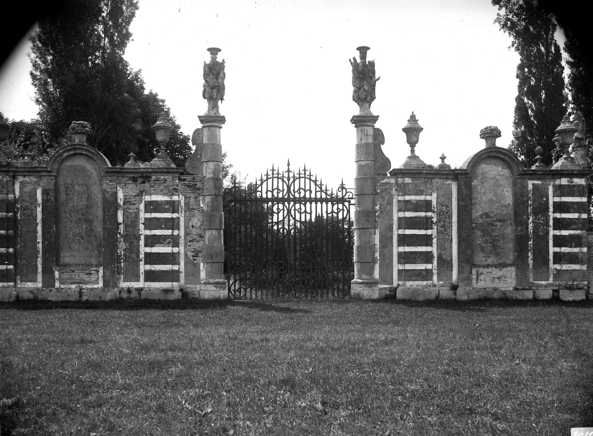 Villa Nazionale di Stra. Porta e cancelli delle mura di cinta, dettagli del cancello con colonna e scala a bovolo