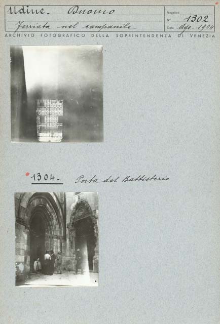 - ISCRIZIONI sul supporto secondario: in alto - Udine - Duomo/ Facciata nel campanile/ ARCHIVIO FOTOGRAFICO DELLA SOPRINTENDENZA DI VENEZIA/ 1304 - Porta del Battistero/ Negativo/ N° 1307/ Data Ago. 1904 - Archivio Fotografico Soprintendenza ai Monumenti di Venezia - a penna/ a stampa - italiano