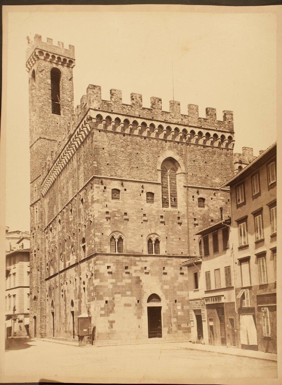- NOTIZIE STORICO CRITICHE Il fondo fotografico Faccioli è costituito da stampe sciolte o incollate su supporto, raccolte nel corso della sua attività di ingegnere-architetto da Raffaele Faccioli (Bologna, 1836-1914). Dopo la sua morte, il geometra Luigi Mattioli, amministratore dei beni degli eredi, propose a Francesco Malaguzzi Valeri, allora Direttore della Pinacoteca di Bologna, l'acquisto di questa raccolta grafica comprendente disegni, taccuini e materiale fotografico. L'acquisizione avvenne in due fasi, tra il 1917 e il 1918. Nei precisi elenchi che testimoniano la transazione si citano: "597 fotografie di diversi formati e soggetti montate su cartone, 624 fotografie di diversi formati e soggetti senza cartone, 31 fotografie su cartone di diverse misure, di soggetti architettonici, e 9 fotografie senza cartone, di diverse misure, di soggetti architettonici" (9 maggio 1917) e "576 fotografie di diversi formati e soggetti" (9 aprile 1918). Il palazzo del Bargello ospita il Museo nazionale sin dal 1865, quando vennero allestite al pian terreno alcune stanze, successivamente poi nel corso dei decenni ampliatosi negli spazi espositivi e arricchitosi di preziosi nuclei collezionistici. Dall'immagine risulta difficile appurare con certezza se il palazzo ospitasse già le raccolte d'arte, anche se pare piuttosto verosimile una datazione posteriore alla metà degli anni Sessanta. La ripresa dell'angolo del palazzo all'incrocio con via della Vigna Vecchia risulta preferenziale per i fotografi fiorentini del periodo: sono rintracciabili alcuni esempi nelle immagini di Giacomo Brogi e dei Fratelli Alinari