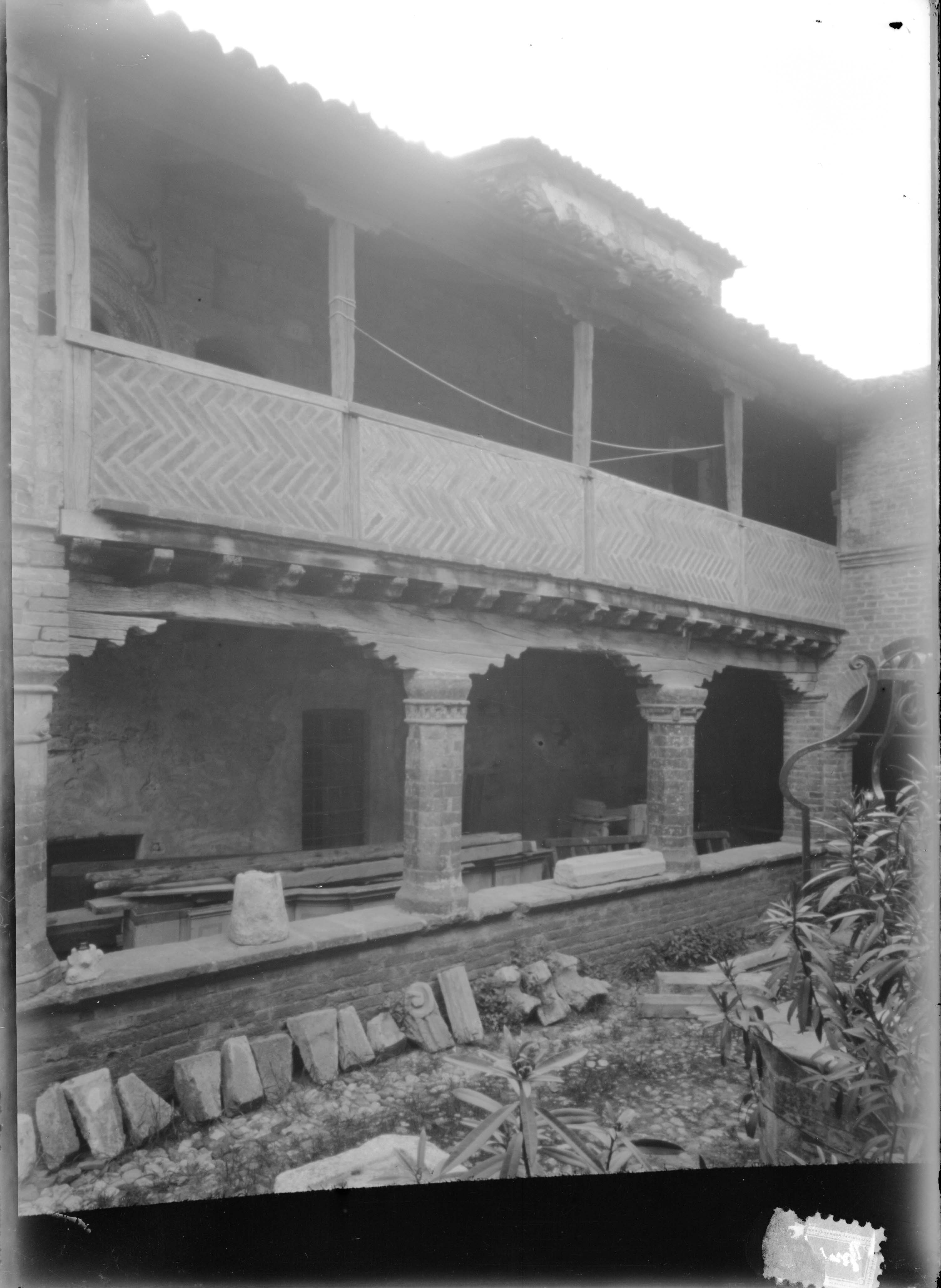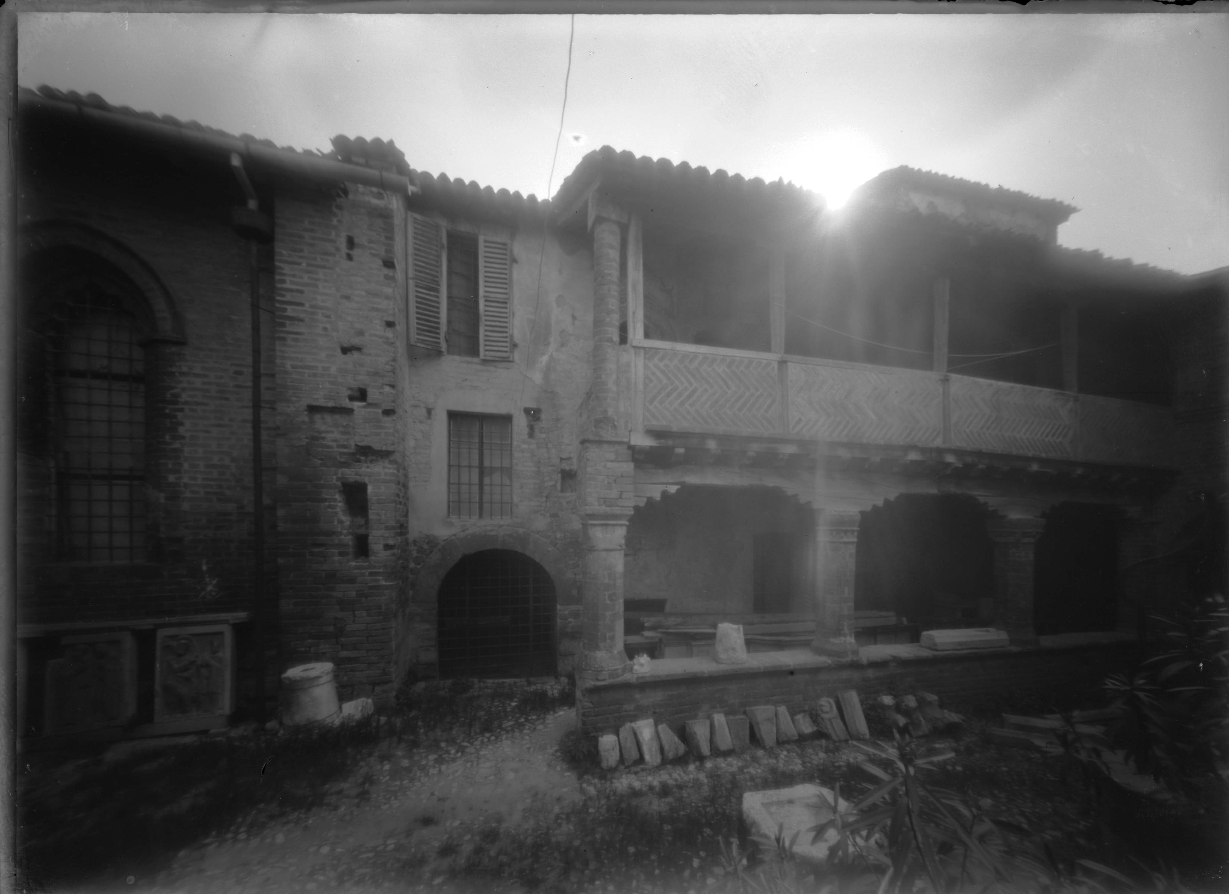 - NOTIZIE STORICO CRITICHE La costruzione della chiesa di Santa Maria risale al 758. Dopo il terremoto del 1117 essa fu ricostruita e consacrata nel 1122. Verso la metà dell’Ottocento la facciata in tufo della chiesa collegiata, conservava ancora le sue linee primitive, ma internamente mostrava i segni degli interventi subiti nei secoli precedenti. A partire dal 1899, il complesso della collegiata di Castell'Arquato è sottoposto a numerosi restauri. Nella seconda relazione dedicata agli interventi di restauro effettuati dall'Ufficio regionale per la conservazione dei monumenti dell'Emilia, il direttore Raffaele Faccioli (1836-1914), specifica che alla fine del 1899 il canonico Andrea Galvani acquistò il chiostro stesso, a patto che fosse restaurato a spese del ministero centrale. E’ in quell’anno che si scoprono gli affreschi quattrocenteschi della cappella di Santa Caterina d’Alessandria. Questo ritrovamento spinse il parroco Don Cagnoni a ricercare, sotto gli stucchi e le decorazioni, le forme romaniche originarie e, con l’aiuto di Don Zancani, avviò una serie di interventi di ripristino. Nel 1906 vennero eseguiti i primi saggi alle murature che portarono alla luce i capitelli romanici delle colonne, coperti dagli stucchi seicenteschi barocchi. Dal 1911 al 1919 si susseguirono numerosi restauri, tra cui la ricostruzione della quarta absidiola contenente una vasca ad immersione dell'VIII secolo e nel 1919 la sistemazione della facciata principale dove venne chiusa una finestra sul lato sinistro e sostituito il rosone preesistente con una bifora. In particolare nel 1911, il parroco Don Cagnoni coadiuvato da Don Giuseppe Franchi, scavando nel sottosuolo della sacrestia, ritrova un piccolo altare, una scultura dell’ambone bizantino e la grande vasca battesimale. Il servizio fotografico in esame riguarda, come indicato sul pergamino, i restauri del 1923 dove vennero ricostruiti i due pilastri tolti alla fine del cinquecento per allargare la chiesa e rifatti i relativi archi di sostegno. Solamente nel 1935 i restauri terminano, sostituendo la volta settecentesca con un nuovo tetto con capriate in legno. In seguito ai lavori di ripristino della chiesa e del piccolo chiostro capitolare, nel 1932 fu istituito il museo della collegiata. Nonostante il pergamino delle lastre N_000440 e N_000447 non riporta l’indicazione della data e dell’autore Castagnoli, si decide di inserirle nel servizio per confronto: N_000440 con N_000434 perché è la medesima ripresa, N_000447 con N_000443 per uniformità tecnica (segno del porta lastre o dello chassis) e di ripresa. Non si hanno informazioni su Castagnoli, l’autore delle lastre. Trattasi molto probabilmente di un fotografo locale di Castell’Arquato, come indicato sul pergamino della lastra N_000466