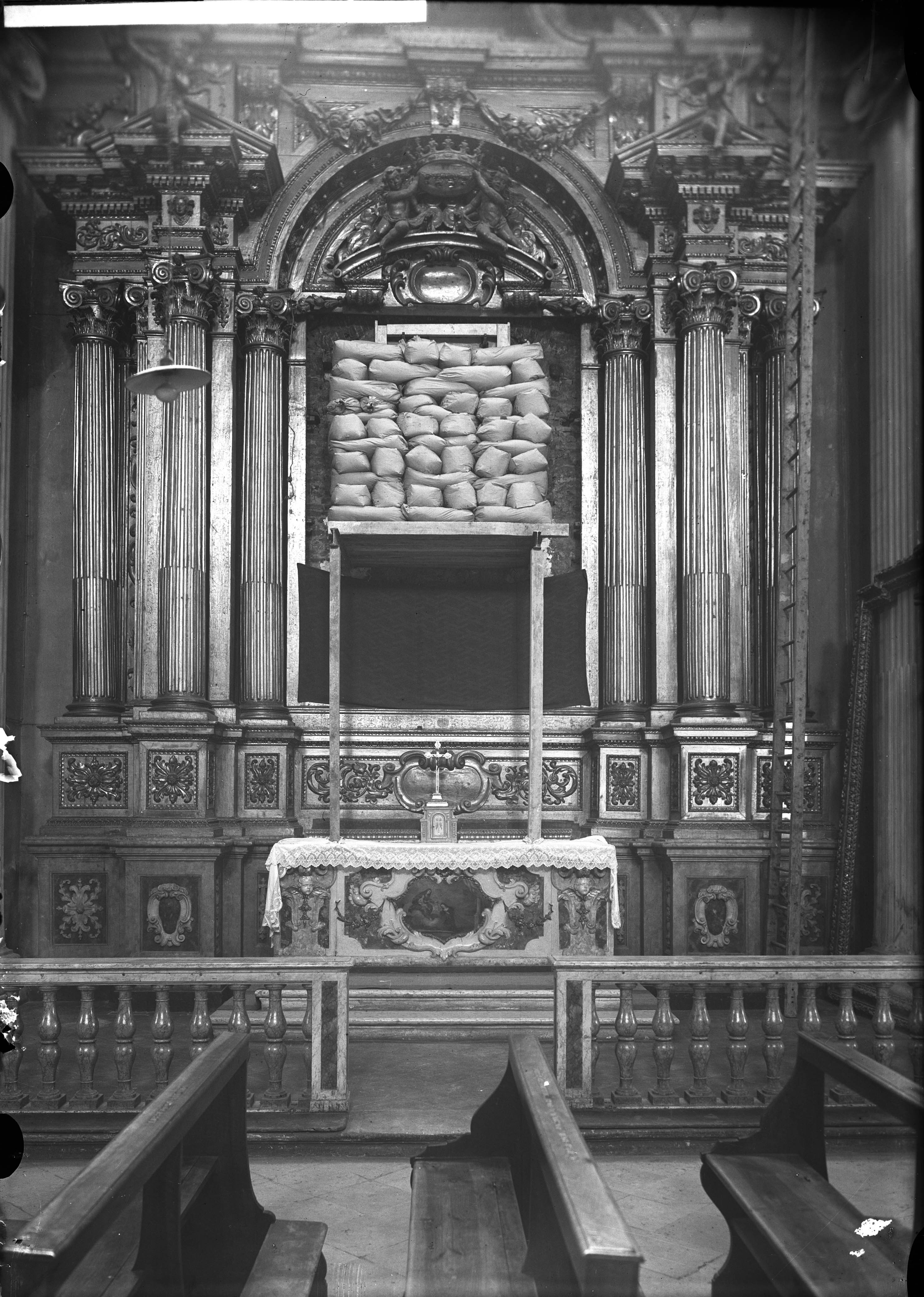 - NOTIZIE STORICO CRITICHE La chiesa di Sant'Agostino fu costruita nel Trecento, nell’area di una “chiesa degli agostiniani” eretta un secolo prima. Tra il 1662 ed il 1663 la duchessa Laura Martinozzi, per celebrare le esequie del marito Alfonso IV d’Este, finanziò un allestimento molto scenografico con apparati decorativi, per l’interno della Chiesa. In seguito a questa trasformazione, tale edificio doveva diventare il Pantheon degli Estensi, destinazione che fu poi assegnata alla Chiesa di San Vincenzo in Corso Canalgrande. Tra le opere conservate nella chiesa, spiccano il gruppo in terracotta Compianto su Cristo morto realizzato da Antonio Begarelli e l’affresco Madonna col Bambino del 1350 di Tommaso da Modena, beni che all’insorgere della Seconda Guerra Mondiale nel 1940, vennero riparati con protezioni antiaeree. Il negativo in esame è stato realizzato dallo studio Bandieri tra il 1940 e il 1945. Rilevata l'attività da Eriberto Vivi - l'ultimo dei figli del fotografo Giuseppe Vivi - Benvenuto Bandieri (1887-1958), dopo aver lavorato alle dipendenze di Umberto Orlandini dal 1910 al 1917, avvia in quello stesso anno nella sede di via Zono n. 8 (Modena), il proprio studio che proseguirà con il figlio William fino al 1981. Benvenuto Bandieri, durante la sua formazione presso gli Orlandini, aveva già una certa esperienza non solo come "ritoccatore" (mestiere con cui si iniziava solitamente l’apprendistato) ma anche come "operatore" e "sorvegliante degli altri operai" com’è scritto sul contratto di assunzione concluso nel 1910 con uno stipendio piuttosto elevato e la partecipazione in minima parte agli utili dell'azienda. Benvenuto prosegue, integrando e aggiornando l'accurato censimento già intrapreso dagli Orlandini, del patrimonio artistico di Modena e provincia (riproduzioni di opere pittoriche scultoree e architettoniche) e a partire dal 1924 anche riprese aeree della "fisionomia del paesaggio urbano e rurale" da utilizzare per cartoline, guide, libri d'arte o turistici. L'attività dello studio fotografico Bandieri fin dall'inizio, si estende oltre la normale routine della committenza privata e, mentre trascura il ritratto, si specializza in foto di macchinari e prodotti industriali che le aziende della provincia cominciano ad utilizzare per i loro campionari di vendita. Riceve un notevole impulso, durante il periodo fascista, anche dalla committenza pubblica: con un organico decisamente più ridotto rispetto allo studio Orlandini (il suo resta per così dire uno studio artigianale che non supera i cinque dipendenti), documenta soprattutto i mutamenti urbanistici della città durante il Ventennio, ma anche le iniziative e le attività del Comune. Le manifestazioni pubbliche, politiche, religiose e sportive, divengono tra gli anni Venti e gli anni Quaranta, una parte importante dell'attività che a partire dal 1930 si arricchisce del contributo del figlio William (1911-1983). Di William è da ricordare che nel luglio del 1935 si classificò fra i terzi premiati al Concorso Nazionale Fotografico delle attività del regime fascista. Notevole è il lavoro di rilevamento dei danni subiti dai monumenti e i palazzi della città all'indomani dei bombardamenti del 1944. Fotografo ufficiale della Società Modenese Fiere e Corse, lo studio Bandieri era incaricato alla registrazione degli arrivi delle gare ippiche e alla documentazione degli eventi e degli stand della fiera campionaria. Dell’organizzazione interna dello studio fotografico si è certi che William si occupava dell’attività di camera oscura, mentre dell’attività di ripresa non è possibile stabilire gli autori. Nel 1958, alla morte di Benvenuto, lo studio cambia ragione sociale mentre cessa definitivamente l'attività il 30 settembre 1981. Sono stati dipendenti e collaboratori dello Studio Bandieri: Lino Vignoli dal 1918 al 1928, dagli anni quaranta Felice Lei sino al 1953, Claudio Sala sino al 1958, Giulio Zagni sino al 1956, Ornello Ascari dal 1958 al 1973 e Alfonso Franchini dal 1966 al 1981