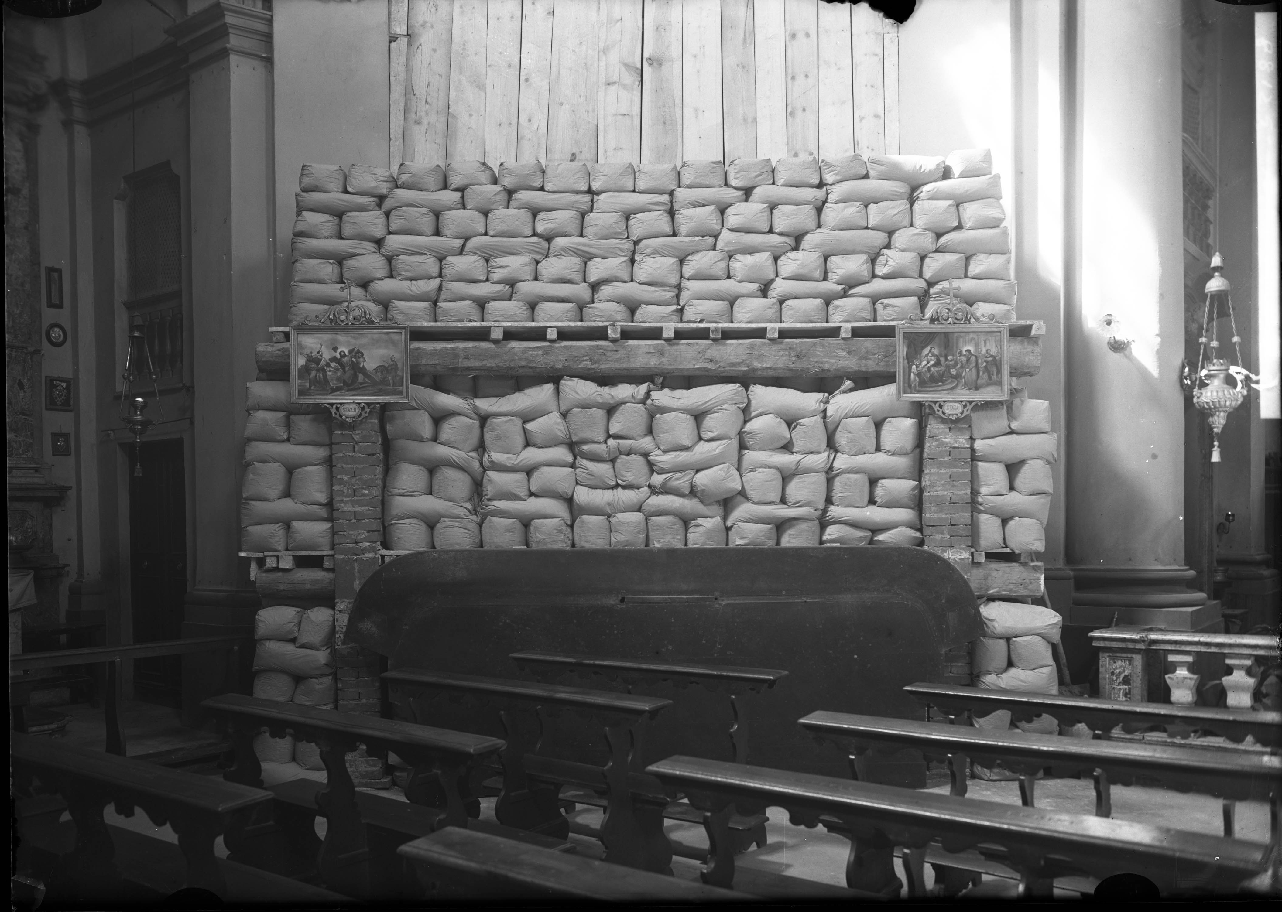 - NOTIZIE STORICO CRITICHE La chiesa fu edificata nel 1723 sul luogo di un edificio del 1190 e di uno cinquecentesco dedicato a San Michele. La chiesa attuale prese il nome dalla Confraternita di San Giovanni Battista della Buona Morte, compagnia dedita ad assistere i condannati alla pena capitale, qui trasferita nel 1774. La chiesa conserva lo splendido gruppo in terracotta raffigurante il Compianto su Cristo Morto, opera di Guido Mazzoni che allo scoppio della Seconda Guerra Mondiale nel 1940, venne riparata con protezioni antiaeree. Il negativo in esame è stato realizzato dallo studio Bandieri tra il 1940 e il 1945. Rilevata l'attività da Eriberto Vivi - l'ultimo dei figli del fotografo Giuseppe Vivi - Benvenuto Bandieri (1887-1958), dopo aver lavorato alle dipendenze di Umberto Orlandini dal 1910 al 1917, avvia in quello stesso anno nella sede di via Zono n. 8 (Modena), il proprio studio che proseguirà con il figlio William fino al 1981. Benvenuto Bandieri, durante la sua formazione presso gli Orlandini, aveva già una certa esperienza non solo come "ritoccatore" (mestiere con cui si iniziava solitamente l’apprendistato) ma anche come "operatore" e "sorvegliante degli altri operai" com’è scritto sul contratto di assunzione concluso nel 1910 con uno stipendio piuttosto elevato e la partecipazione in minima parte agli utili dell'azienda. Benvenuto prosegue, integrando e aggiornando l'accurato censimento già intrapreso dagli Orlandini, del patrimonio artistico di Modena e provincia (riproduzioni di opere pittoriche scultoree e architettoniche) e a partire dal 1924 anche riprese aeree della "fisionomia del paesaggio urbano e rurale" da utilizzare per cartoline, guide, libri d'arte o turistici. L'attività dello studio fotografico Bandieri fin dall'inizio, si estende oltre la normale routine della committenza privata e, mentre trascura il ritratto, si specializza in foto di macchinari e prodotti industriali che le aziende della provincia cominciano ad utilizzare per i loro campionari di vendita. Riceve un notevole impulso, durante il periodo fascista, anche dalla committenza pubblica: con un organico decisamente più ridotto rispetto allo studio Orlandini (il suo resta per così dire uno studio artigianale che non supera i cinque dipendenti), documenta soprattutto i mutamenti urbanistici della città durante il Ventennio, ma anche le iniziative e le attività del Comune. Le manifestazioni pubbliche, politiche, religiose e sportive, divengono tra gli anni Venti e gli anni Quaranta, una parte importante dell'attività che a partire dal 1930 si arricchisce del contributo del figlio William (1911-1983). Di William è da ricordare che nel luglio del 1935 si classificò fra i terzi premiati al Concorso Nazionale Fotografico delle attività del regime fascista. Notevole è il lavoro di rilevamento dei danni subiti dai monumenti e i palazzi della città all'indomani dei bombardamenti del 1944. Fotografo ufficiale della Società Modenese Fiere e Corse, lo studio Bandieri era incaricato alla registrazione degli arrivi delle gare ippiche e alla documentazione degli eventi e degli stand della fiera campionaria. Dell’organizzazione interna dello studio fotografico si è certi che William si occupava dell’attività di camera oscura, mentre dell’attività di ripresa non è possibile stabilire gli autori. Nel 1958, alla morte di Benvenuto, lo studio cambia ragione sociale mentre cessa definitivamente l'attività il 30 settembre 1981. Sono stati dipendenti e collaboratori dello Studio Bandieri: Lino Vignoli dal 1918 al 1928, dagli anni quaranta Felice Lei sino al 1953, Claudio Sala sino al 1958, Giulio Zagni sino al 1956, Ornello Ascari dal 1958 al 1973 e Alfonso Franchini dal 1966 al 1981