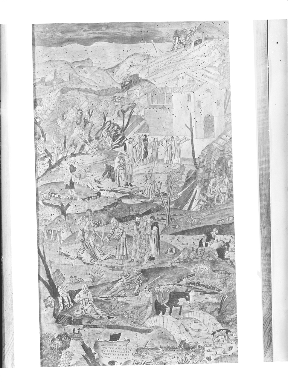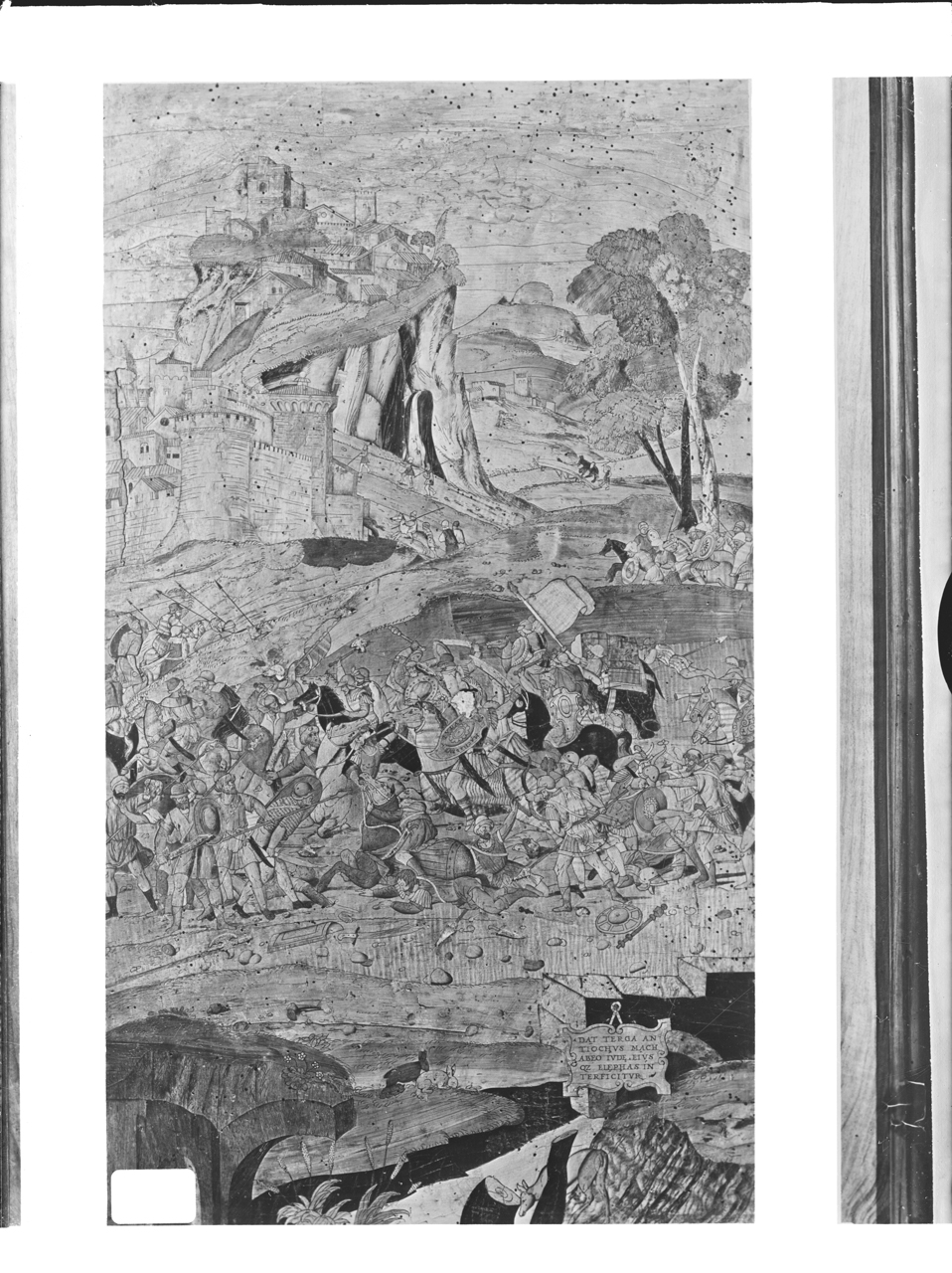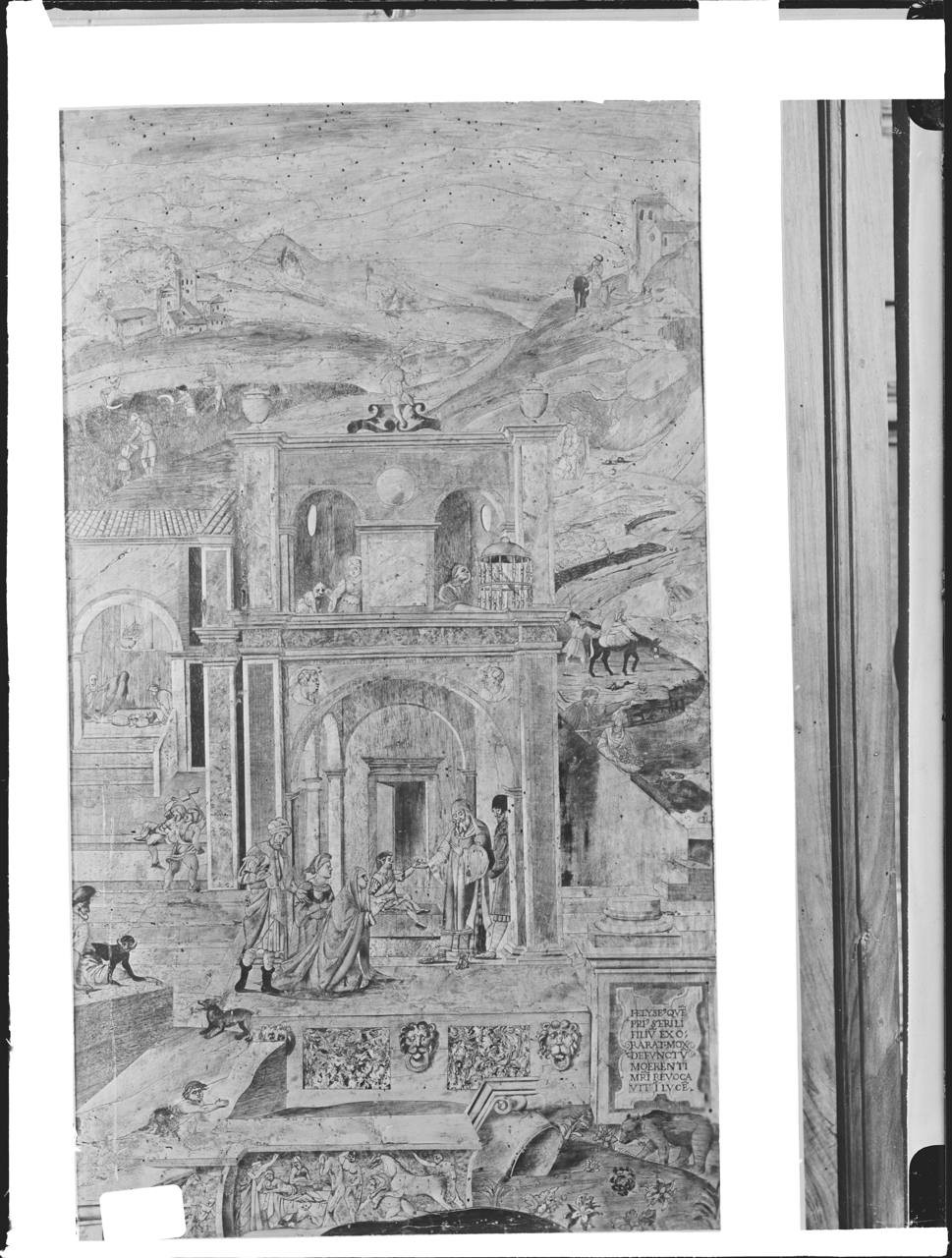 - NOTIZIE STORICO CRITICHE I negativi in esame fanno parte di un servizio fotografico realizzato dalla Ditta Villani per documentare le tarsie presenti nella Basilica di S. Domenico a Bologna. Probabilmente è stato eseguito tra il mese di maggio e il 30 giugno 1943, quando gli stalli del coro e gli sportelli degli armadi della sagrestia furono smontati e trasferiti nella villa Aria di Marzabotto, al fine di proteggere l’opera durante la Seconda guerra mondiale (BIBH: BAPB0110, p. 15). Lo Studio Villani, tra il 1920 e il 1950, è interprete di un periodo storicamente complesso, a cavallo tra le due guerre prima e affrontando la fase post bellica poi. In particolare, tra il 1943 e il 1945, lo Studio viene incaricato di eseguire campagne fotografiche volte a documentare i monumenti per avere un punto di riferimento per i successivi restauri, ma anche gli esiti dei gravi bombardamenti che devastarono parte del centro storico di Bologna (BIBH: BAPB0109, p. 157; BAPB0061, p. 14) I negativi in esame realizzati da Villani mostrano le tarsie presenti nella parte superiore dell’armadio di destra della sagrestia con scene dell’Antico Testamento: Giona gettato nelle fauci della balena, dopo tre giorni, per ordine di Dio, viene dalla medesima rigettato incolume sulla spiaggi (N_002220); Il Re Antioco Epifane fugge alla vista di Giuda Maccabeo e il suo elefante viene ucciso (N_002230); Una scure, casualmente caduta nelle acque profonde del fiume Giordano, torna a galla per ordine del profeta Eliseo (N_002228); Eliseo dapprima intercede per la nascita di un figlio a una donna sterile, poi, dopo l'improvvisa morte del piccolo, lo restituisce vivo alla madre (N_002234). Nella parte inferiore (v. NCTN 0800640720) sono raffigurate le storie di S. Domenico. Il fotografo ho inquadrato ciascuna tarsia nella sua interezza e l’ha isolata dallo sfondo servendosi di una mascheratura in carta adesiva nera. Le tarsie degli armadi della Sagrestia, realizzate da Fra Damiano Zambelli da Bergamo, erano state create come Spalliera della Cappella di S. Domenico. Purtroppo dopo essere stata smontata, quando la cappella gotica fu abbattuta, andarono perdute le strutture e si salvarono soltanto 18 tarsie. Di queste, 16 furono utilizzate per creare gli armadi della sagrestia, mentre due furono smarrite (BIBH: BAPB1224, pp. 44-53). Durante le due guerre tali tarsie furono smontate per evitare distruzioni per poi ritornare al loro posto subito dopo nel 1946 (BIBH: BAPB1205, p. 145-146). Il Soprintendente Barbacci, il 13 febbraio 1946, scrive una lettera indirizzata alla Direzione Generale AA. E BB. AA. del Ministero della Pubblica Istruzione per dar conto “dei lavori da compiersi in occasione del capitolo generale dei Domenicani che si terrà a Bologna il prossimo settembre”. In particolare il “restauro del coro, uno dei più belli d’Italia, intarsiato da Fra’ Damiano da Bergamo che, secondo il Vasari, si valse, per le prospettive, di disegni del Vignola e del Serlio” (FNTI: BAPF023). Allegato alla suddetta lettera vi è un preventivo di spesa che per il coro ligneo è stimato in lire 700.000 e prevede: “restauro delle tarsie, circa settanta specchi, che presentano lacune, sollevamento delle squame lignee e oscuramento causato da sudiciume. Restauro degli stalli, che hanno perduto alcuni elementi decorativi e sono in gran parte sconnessi e deformati”