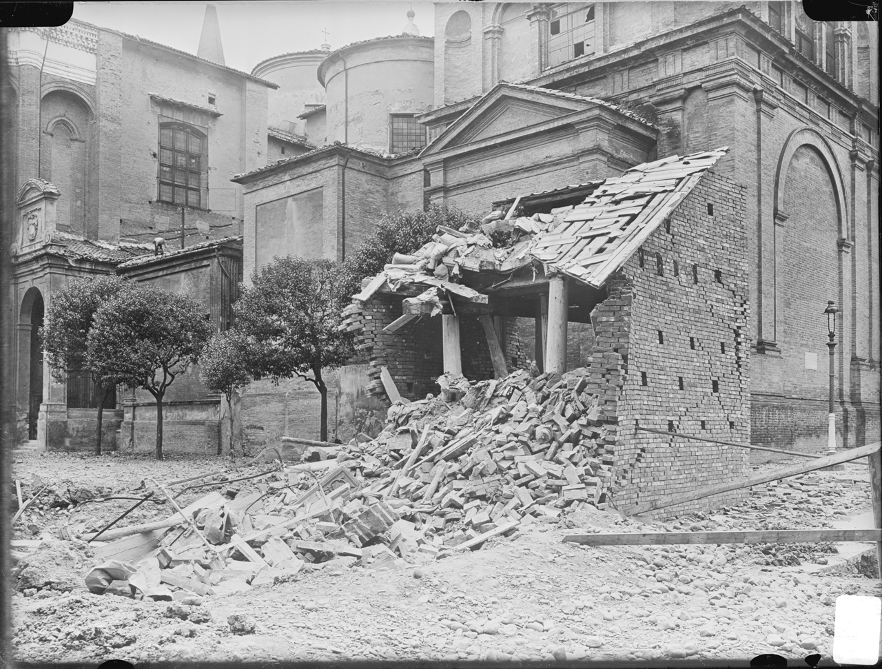 - NOTIZIE STORICO CRITICHE Nell’archivio fotografico della SABAP sono conservati 26 negativi su lastra (v. paragrafo RV - RELAZIONI) che documentano la tomba di Rolandino de’ Passeggeri dalla messa in sicurezza per la protezione antiaerea durante la Seconda guerra mondiale, al crollo dovuto alla caduta di una bomba il 24 luglio 1943 (BIBH: BAPB0110, p. 20), per poi passare al restauro fino al completamento dello stesso. Questa documentazione fotografica è stata realizzata dal 1940 ca. fino al 1952 da due fotografi bolognesi: Villani e Zagnoli. Lo Studio Villani, tra il 1920 e il 1950, è interprete di un periodo storicamente complesso, a cavallo tra le due guerre prima e affrontando la fase post bellica poi. In particolare, tra il 1943 e il 1945, lo Studio viene incaricato di eseguire campagne fotografiche volte a documentare i monumenti per avere un punto di riferimento per i successivi restauri ma anche gli esiti dei gravi bombardamenti che devastarono parte del centro storico di Bologna (BIBH: BAPB0109, p. 157), come mostra la lastra in esame. La lastra, N_001151, è stata pubblicata nel quotidiano L’Avvenire il 22 gennaio 1949 (BIBH: BAPB1217), mentre N_001150 nel saggio di Amaldi pubblicato nel Bollettino d’arte (BIBH: BAPB1215, p. 268 fig. 4). Il negativo in esame realizzato da Villani mostra gli esiti rovinosi dell’incursione aerea del 24 luglio 1943 sulla Tomba di Rolandino: “- Crollata quasi completamente, colpita in pieno da una bomba caduta ai piedi del mausoleo. – Gravi frantumazioni varie della lastra del coperchio e della cassa rettangolare del sarcofago. – Primi provvedimenti: rimozioni delle parti architettoniche e decorative rimaste in opera e recupero degli altri elementi artistici fra le macerie. Per il sarcofago: recupero delle parti frantumate e degli elementi decorativi della tomba. – Osservazioni: la tomba potrebbe ricostruirsi dopo la guerra” (BIBH: BAPB0109, p. 110). È probabile che una di queste fotografie sia stata inviata dal Soprintendente Barbacci al Ministero della Pubblica Istruzione il 25 maggio 1950 (FNTI: BAPF030)