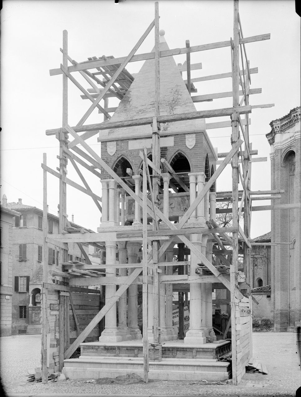 - NOTIZIE STORICO CRITICHE Nell’archivio fotografico della SABAP sono conservati 26 negativi su lastra (v. paragrafo RV - RELAZIONI) che documentano la tomba di Rolandino de’ Passeggeri dalla messa in sicurezza per la protezione antiaerea durante la Seconda guerra mondiale, al crollo dovuto alla caduta di una bomba il 24 luglio 1943 (BIBH: BAPB0110, p. 20), per poi passare al restauro fino al completamento dello stesso. Questa documentazione fotografica è stata realizzata dal 1940 ca. fino al 1952 da due fotografi bolognesi: Villani e Zagnoli. Il negativo in esame realizzato da Villani mostra uno stadio molto avanzato dei lavori di ricostruzione della tomba di Rolandino de' Passeggeri. Lo Studio Villani, tra il 1920 e il 1950, è interprete di un periodo storicamente complesso, a cavallo tra le due guerre prima e affrontando la fase post bellica poi. In particolare, tra il 1943 e il 1945, lo Studio viene incaricato di eseguire campagne fotografiche volte a documentare i monumenti per avere un punto di riferimento per i successivi restauri ma anche gli esiti dei gravi bombardamenti che devastarono parte del centro storico di Bologna (BIBH: BAPB0109, p. 157; BAPB0061, p. 14), come mostra la lastra in esame. Da uno studio comparato della documentazione fotografica, di un documento archivistico e di un articolo del Giornale dell’Emilia del 4 aprile 1950 (BIBH: BAPB1218) possiamo ipotizzare che questa lastra sia stata ripresa nel marzo 1950: nel febbraio è stato completato il rivestimento della cuspide piramidale con i laterizi invetriati (FNTI: BAPF032), mentre dall’articolo del 4 aprile apprendiamo che i lavori erano pressoché conclusi e si attendeva soltanto la rimozione del “castello di legno che servì pei lavori”; l’analisi della lastra permette di ipotizzare che il rivestimento della cuspide con i mattoni sia terminato (le impalcature superiori sono state in parte smontate), manca ancora l’inserimento sulla sommità della sfera sormontata dalla croce e il coperchio è già stato posto con l’ausilio di alcune travi sopra il sarcofago. Non risulta neanche visibile la costruzione (NCTN 0800640757) dov’era stato probabilmente restaurato il sarcofago (NCTN 0800640756). Non sembra quindi un caso che questa volta Villani abbia cambiato inquadratura: da questa visione è infatti possibile vedere tutti questi particolari