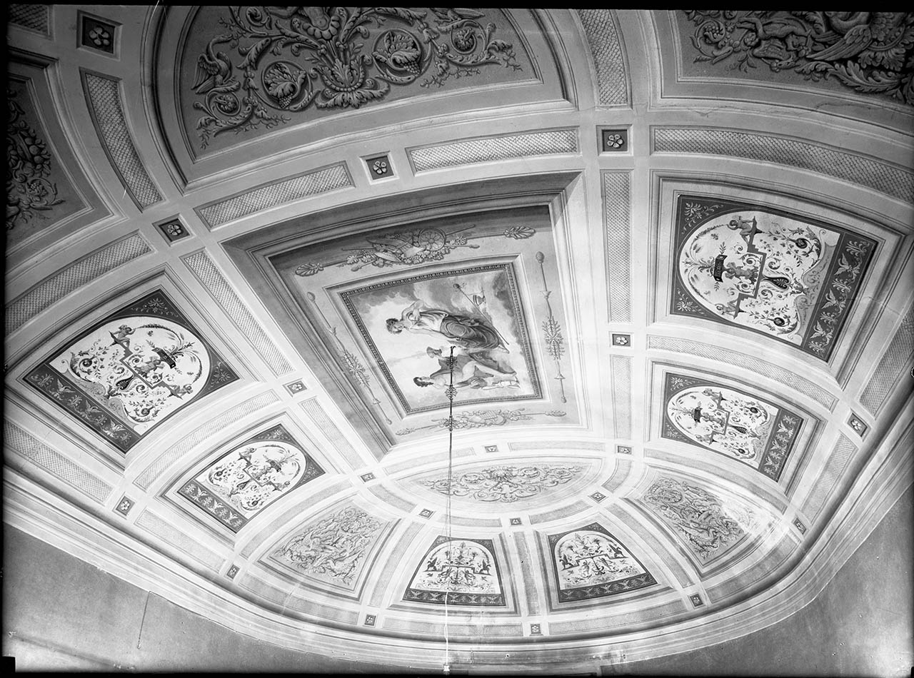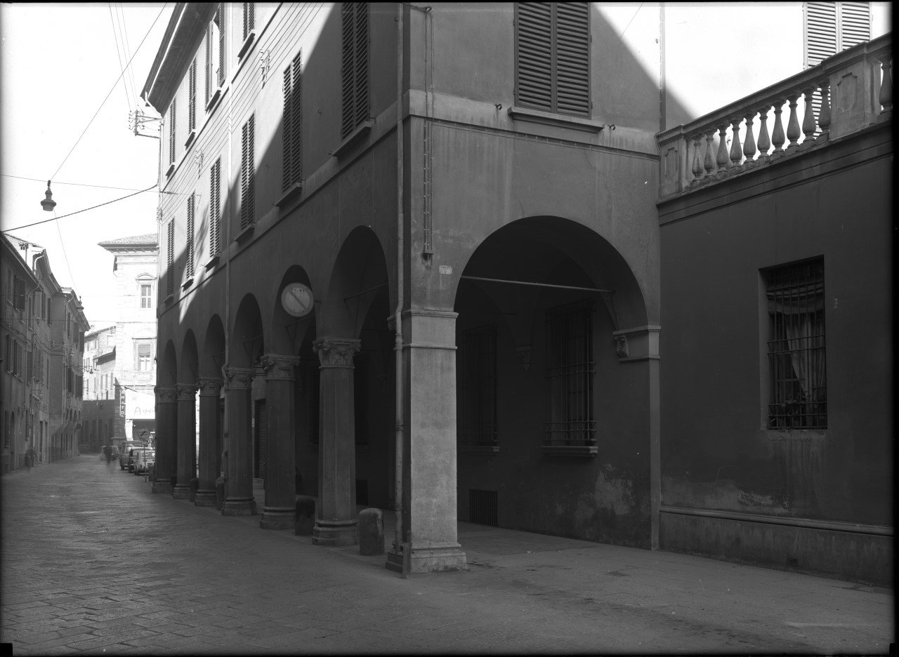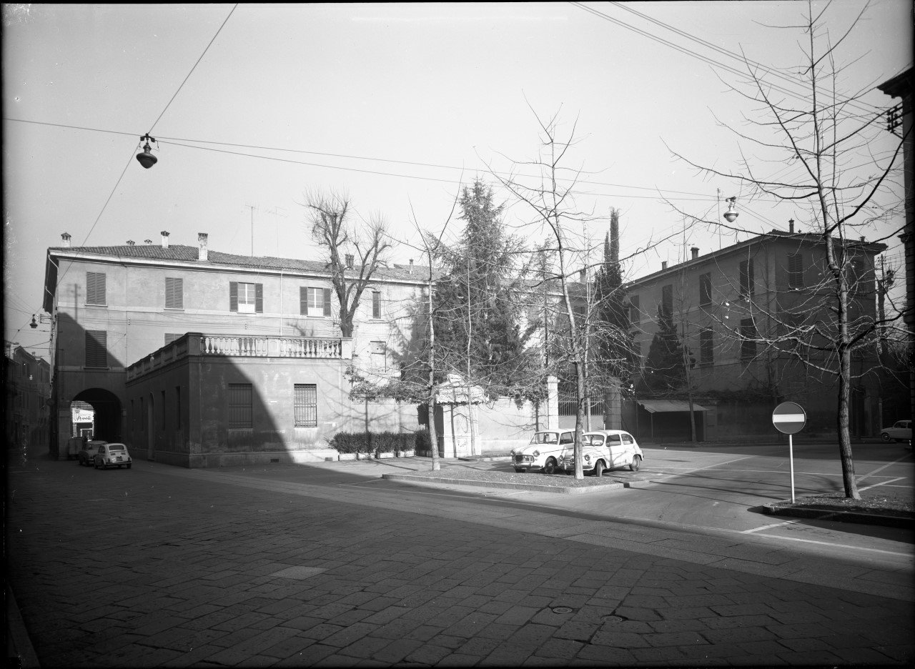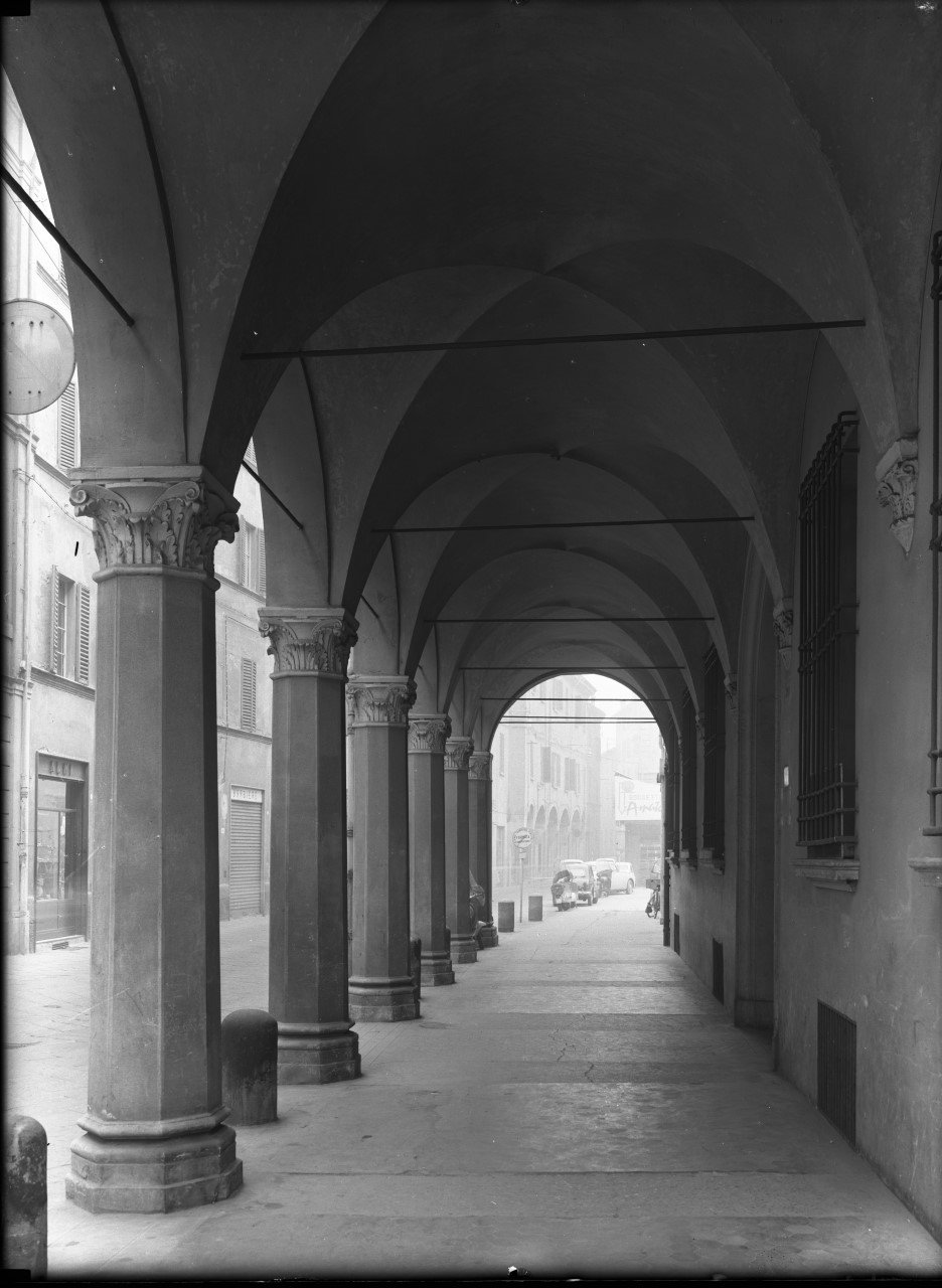 - NOTIZIE STORICO CRITICHE Le ragioni di questa documentazione fotografica si ricostruiscono grazie ad alcuni carteggi conservati presso l'Archivio Storico SABAP di Bologna (STORICO 488). L'11 settembre 1961 per l'edificio posto al civico 1 di Via Castagnoli viene proposto un decreto di vincolo urgente della Soprintendenza, a norma della legge 1 giugno 1930, n. 1089, poiché possiede "importante interesse storico artistico per il portico ed il vestibolo rinascimentali e per le sale decorate nella volta con pregevoli dipinti dell'epoca neoclassica" (lettera del Soprintendente Alfredo Barbacci al Ministero Pubblica Istruzione - Direzione Generale Antichità e Belle Arti). Il 25 ottobre viene emesso il provvedimento ministeriale notificato il 7 dicembre dello stesso anno. I proprietari, avendo intenzione di modificare completamente l'assetto interno dell'edificio, ricorrono e presentano un documento del decoratore Arnaldo Gentili, incaricato di eseguire i lavori, che sminuisce del tutto la qualità delle pitture murali, datandole addirittura al 1932 (anno di un precedente intervento manutentivo). Il 30 ottobre Barbacci predispone una perizia dei dipinti da parte del restauratore Renato Pasqui che produrrà una relazione in cui si sottolinea che si tratta di "dipinti a tempera di fine fattura, in ottime condizioni conservative, risalenti al primo quarto del secolo scorso e attribuibili al Basoli o a qualcuno dei pittori decoratori del tempo [...] per cui possiamo affermare che il ciclo dei dipinti [...] conserva tutto il suo valore storico artistico" (relazione dell'11 novembre 1962). Contestualmente Barbacci intende inviare un fotografo a riprendere gli ambienti interni e la struttura porticata posta sulla facciata del palazzo. In una lettera del 12 novembre l'avvocato che segue il ricorso scrive a Barbacci "sarò ben lieto di avere l'opportunità di essere con Lei nella visita per le fotografie". La data è dunque confermata anche dalle iscrizioni sui pergamini che contenevano le lastre: è indicato il 27 novembre 1962 e pochi giorni più tardi (8 dicembre) le stampe saranno inviate al Ministero con lettera di accompagnamento. Il vincolo resta e la perizia redatta dal Gentili è priva di fondamento. Le immagini realizzate dallo studio Villani mostrano le sale interne del palazzo, secondo la descrizione precisa e dettagliata per tipologie decorative e soggetti mitologici che ne offre Pasqui nel suo documento. E' documentato l'appartamento denominato Ghigi (con cinque sale e relative decorazioni: N_003248, N_003249, N_003256, N_003281, N_003431, N_003432) e l'appartamento posto di fronte, sempre al primo piano (N_003253, N_003254, N_003255, N_003257). Sono inoltre presenti tre scatti dell’esterno che mostrano una veduta laterale su Largo Respighi (N_003250), una ripresa scorciata della facciata con il porticato (N_003251) e una veduta prospettica del portico (N_003252)