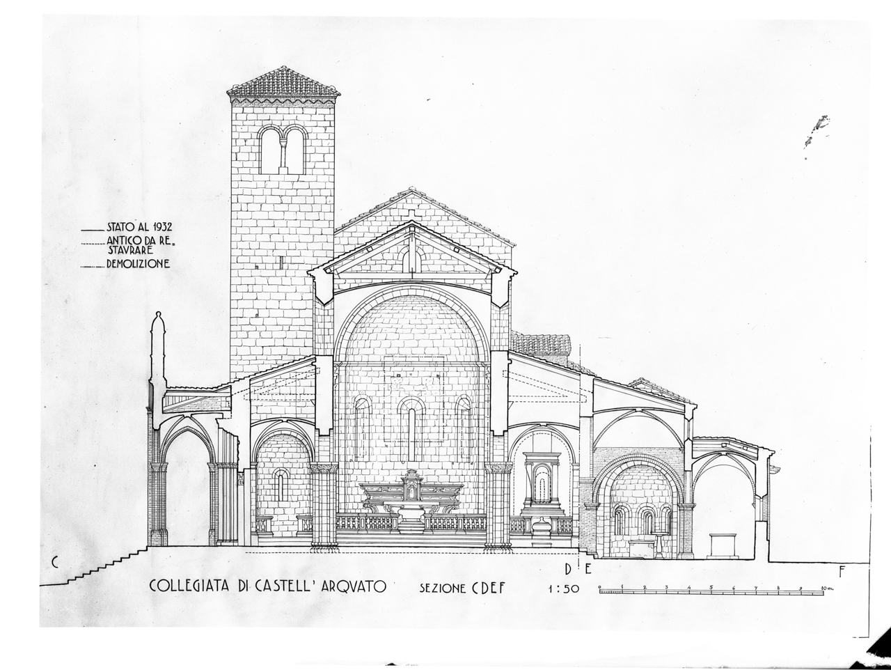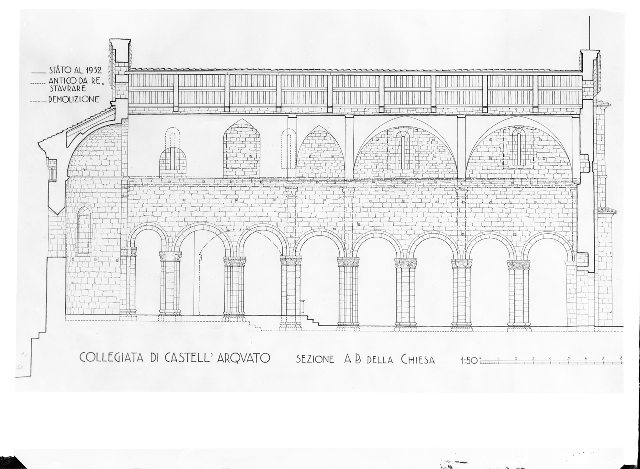 - NOTIZIE STORICO CRITICHE La costruzione della chiesa di Santa Maria, sorta sull'area di un primitivo tempio pagano, risale al 758. In seguito al terremoto del 1117, essa fu ricostruita e consacrata cinque anni dopo, nel 1122. A metà dell’Ottocento, mentre la facciata in tufo della chiesa conservava ancora le sue linee medioevali primitive, erano evidenti all'interno i segni degli interventi subiti nel corso dei secoli. Dal 1899, il complesso della Collegiata di Castell'Arquato fu sottoposto ad una successione di importanti restauri. In quello stesso anno, la scoperta degli affreschi quattrocenteschi nella cappella di Santa Caterina d’Alessandria, spinse il parroco Don Cagnoni a ricercare con l’aiuto di Don Zancani, le forme romaniche originarie sotto gli stucchi e le decorazioni barocche, avviando così una lunga serie di interventi di recupero. Dal 1911 al 1919, scavando nel sottosuolo della sagrestia, vennero alla luce un piccolo altare, una scultura dell’ambone bizantino e la grande vasca battesimale; inoltre fu ricostruita la quarta absidiola per la vasca ad immersione dell'VIII secolo e fu sistemata la facciata principale con l'inserimento di una bifora in sostituzione del rosone preesistente. Il servizio fotografico in esame è composto dalla riproduzione della planimetria e delle sezioni trasversali della collegiata di Castell'Arquato, allo stato attuale del 1932. Le tavole, in cui sono indicate le demolizioni e l'antico da restaurare, sono la testimonianza degli ultimi lavori eseguiti tra il 1932 ed il 1935. Il recupero attuato in quegli anni, consistette nell'abbassamento del piano di calpestio per fare emergere i basamenti delle colonne, nella ricostruzione delle pareti esterne delle navate minori e nella conseguente demolizione delle piccole cappelle laterali costruite intorno al 1730. Tenendo conto di questi ultimi interventi conservativi, si decide di collocare cronologicamente il servizio fotografico in disamina - realizzato da autore ignoto forse come documentazione interna per la Soprintendenza - tra il 1932 ed il 1950