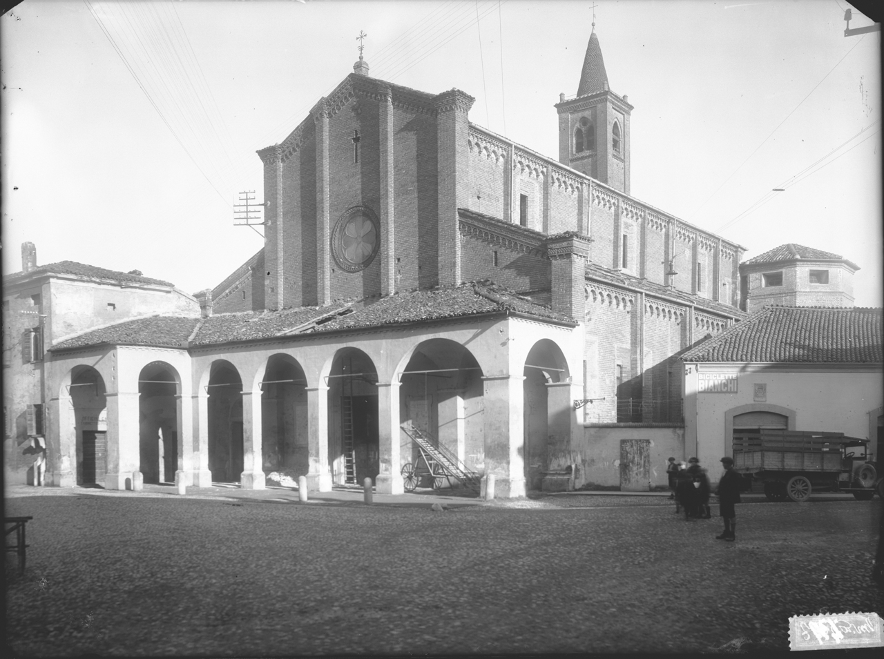 - NOTIZIE STORICO CRITICHE Il complesso della Chiesa di San Francesco d’Assisi comprensivo dell’attiguo convento, era già presente nel XIII secolo, ai primordi dell’assetto urbano della città dei Pico di Mirandola. Trattasi questa di una delle prime chiese francescane d’Italia costruita subito dopo la canonizzazione del Santo avvenuta nel 1228. Modificata architettonicamente nella forma corrente nel corso del XV secolo, è tutt’ora uno degli edifici più antichi della piccola cittadina della provincia di Modena, ed uno dei più importanti in quanto Pantheon della famiglia Pico. Dopo alcune chiusure e riaperture al culto, la chiesa giunse nella seconda metà dell’Ottocento, in pessime condizioni. Un primo accurato restauro avvenne nel 1870, grazie al finanziamento del Comune di Mirandola ed alla carità cittadina. Nel XX secolo, si deve al sollecito della Congregazione del Terz’Ordine Francescano di Mirandola e all’interessamento del Soprintendente Luigi Corsini (1863-1949, dal 1894 nominato assistente-disegnatore dell’Ufficio regionale per la conservazione dei Monumenti dell’Emilia, tra il 1914 ed il 1933 soprintendente ai Monumenti dell’Emilia) se nel 1925, l’amministrazione comunale assieme alla Soprintendenza regionale, elaborano un progetto di restauro rivolto all’intera Chiesa monumentale. L’intervento di ristrutturazione prevedeva il ripristino fedele “secondo le tracce venute in luce” delle finestre della navata maggiore, della nave meridionale e dell’abside, mentre “la sistemazione del portico antistante la facciata verrà accuratamente studiata da questo R. Ufficio, il quale si riserva di presentare le sue conclusioni” (Corsini, 1926). Nel tentativo di conferire all’edificio un aspetto il più possibile vicino a quello originale, i lavori di ripulitura, di riordino e di restauro archeologico durarono oltre un decennio, dal 1926 al 1938. Il servizio fotografico in esame documenta la facciata della Chiesa di San Francesco (N_001504, N_001505 e N_001507), la fiancata meridionale (N_001506), ed il muro esterno dell’abside (N_001503) prima dei restauri del 1927. La recente monografia “La chiesa e il convento di San Francesco di Mirandola” curata dallo studioso Mauro Calzolari, raccoglie tutti i documenti relativi alla chiesa francescana dalla sua edificazione sino al terremoto del 2012, che l’ha gravemente danneggiata. All’interno di questa pubblicazione, è stata rintracciata una lettera (p. 246) datata 21 settembre 1927, inviata dal Podestà U. Trapletti al Soprintendente Corsini, in cui si richiede un urgente intervento di demolizione del porticato settecentesco della facciata, poiché gravemente lesionato dalle infiltrazioni d’acqua sui pilastri e dallo sgretolamento della malta. Tale documento consente di datare il servizio fotografico in disamina entro il 21 settembre del 1927. Il negativo N_001503, oltre a mostrare lo stato di fatto dell’abside prima dei restauri degli anni Venti-Trenta del Novecento, che videro il ripristino della vetrata gotica sotto la vetrata circolare, registra nell’angolo inferiore destro, l’ombra del fotografo dello studio Bolognesi Orsini e del suo banco ottico, nel preciso istante dello scatto fotografico. I pergamini delle matrici, indicano erroneamente la Chiesa di San Francesco d'Assisi di Modena, anziché di Mirandola. Il negativo N_001503 in corrispondenza del cielo, è stato ritoccato sul lato vetro con vernice rossa opaca utilizzando i polpastrelli delle dita