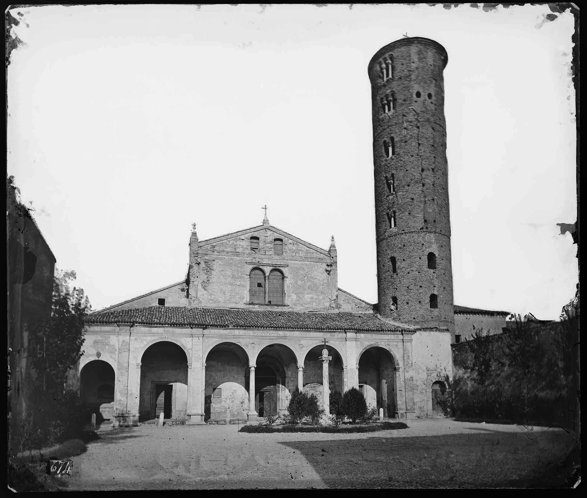 - ISCRIZIONI pergamino: recto - MINISTERO PER I BENI CULTURALI E AMBIENTALI/ SOPRINTENDENZA PER I BENI AMBIENTALI/ E ARCHITETTONICI/ Per le provincie di Ravenna, Ferrara, Forlì/ - RAVENNA -/ 6-C-46/ 14177/ RA/ Chiesa di S. Apollinare N./ Facciata e campanile -
