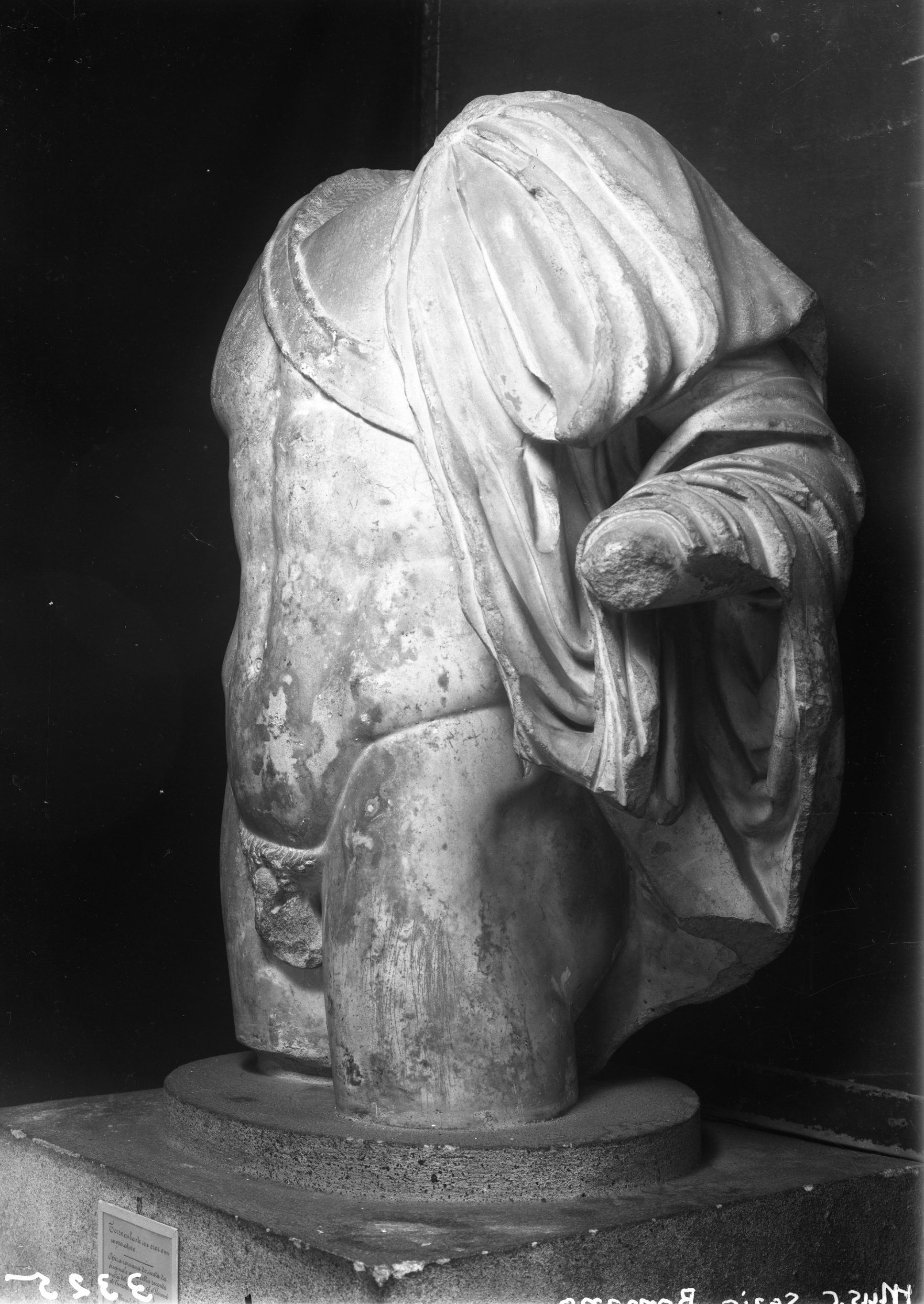 Bologna, museo civico. Statua virile nuda con clamide sulla spalla sinistra, mancante della testa, delle braccia e degli arti inferiori