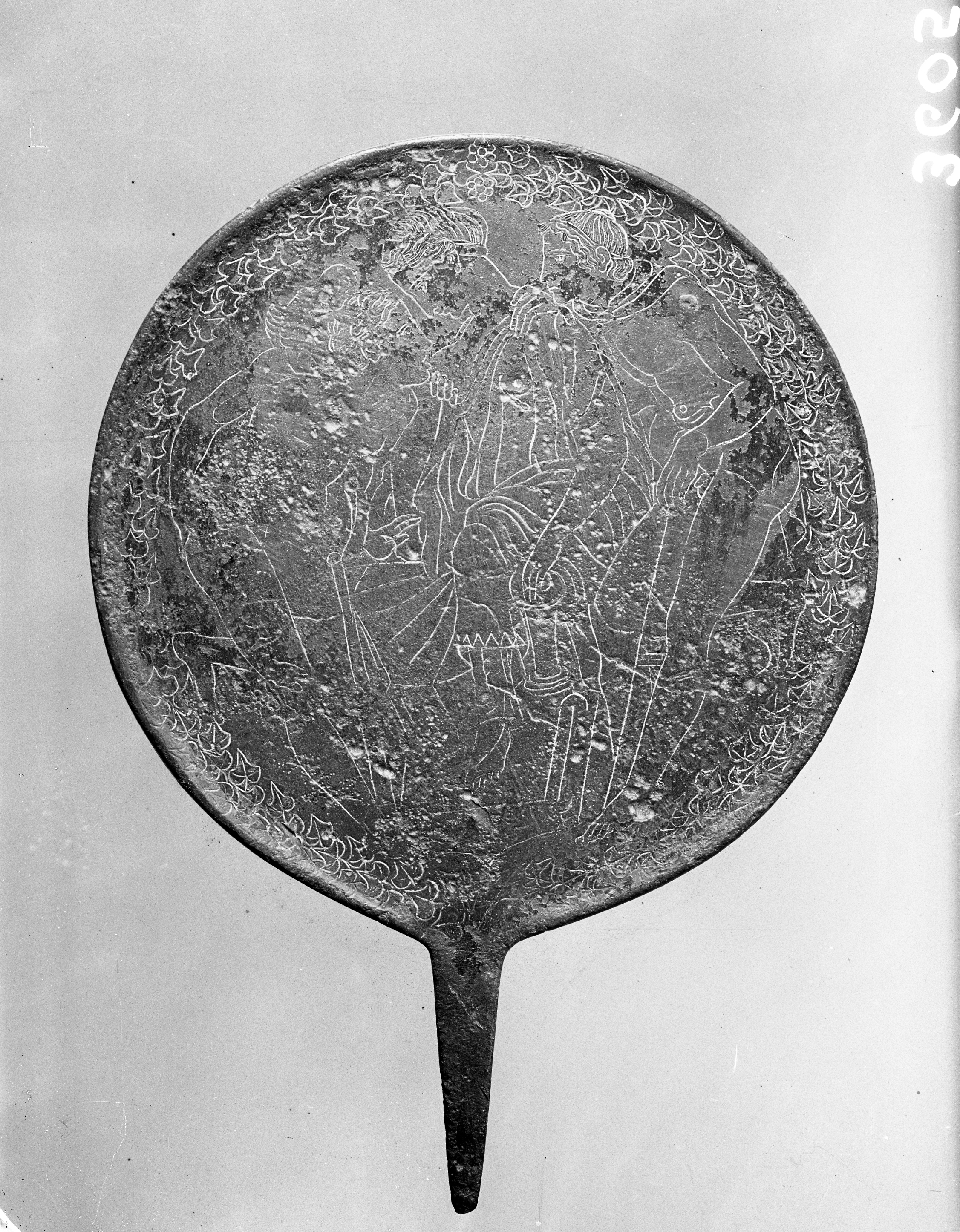 Bologna, Museo civico. Specchio inciso in metallo con scena di mito greco: Era che attraverso l'allattamento "adotta" Eracle