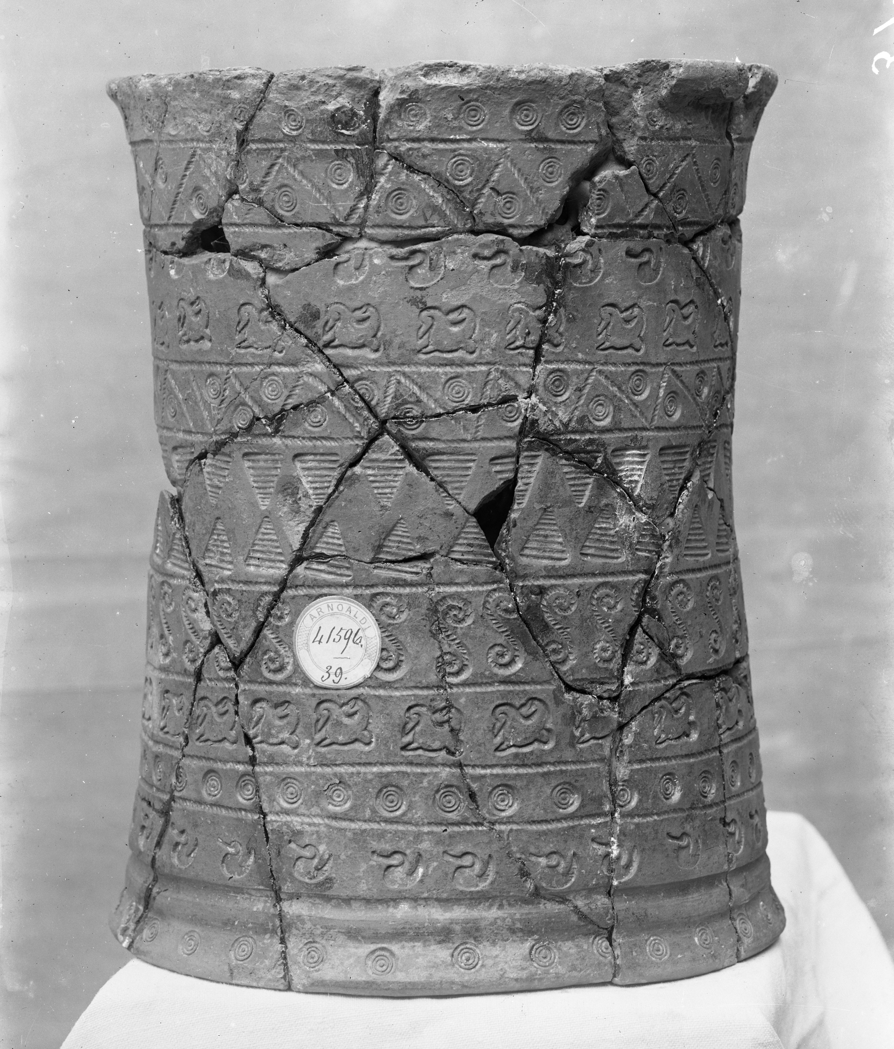 Vaso cilindrico di terracotta. Corpo decorato a stampiglie (paperelle, figure umane, elementi a S, triangoli). Bologna, necropoli Arnoaldi