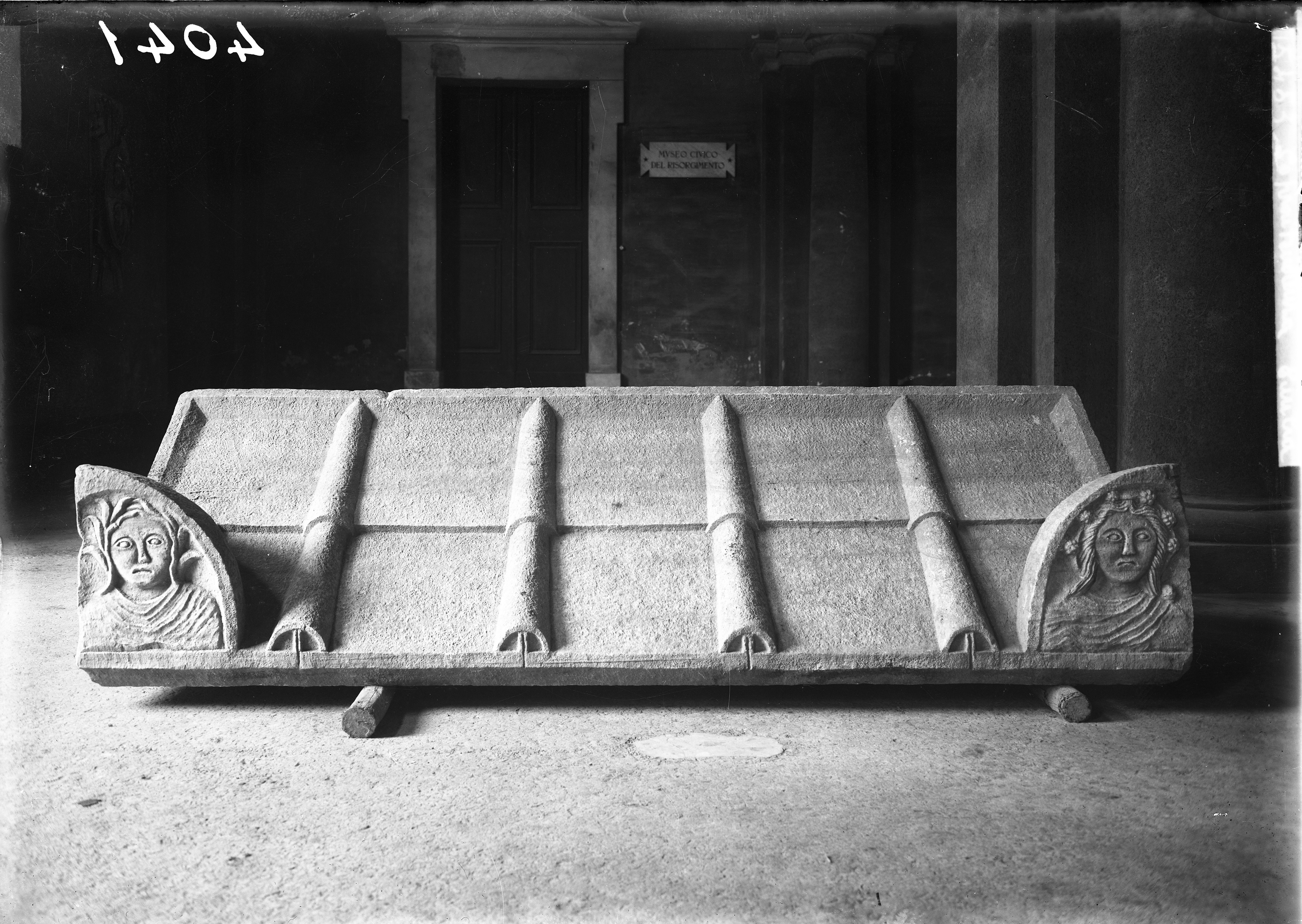 Modena 1947, scavi per le fondazioni del cinema Odeon. Coperchio di sarcofago a tetto con rappresentazioni simboliche delle stagioni negli acroteri