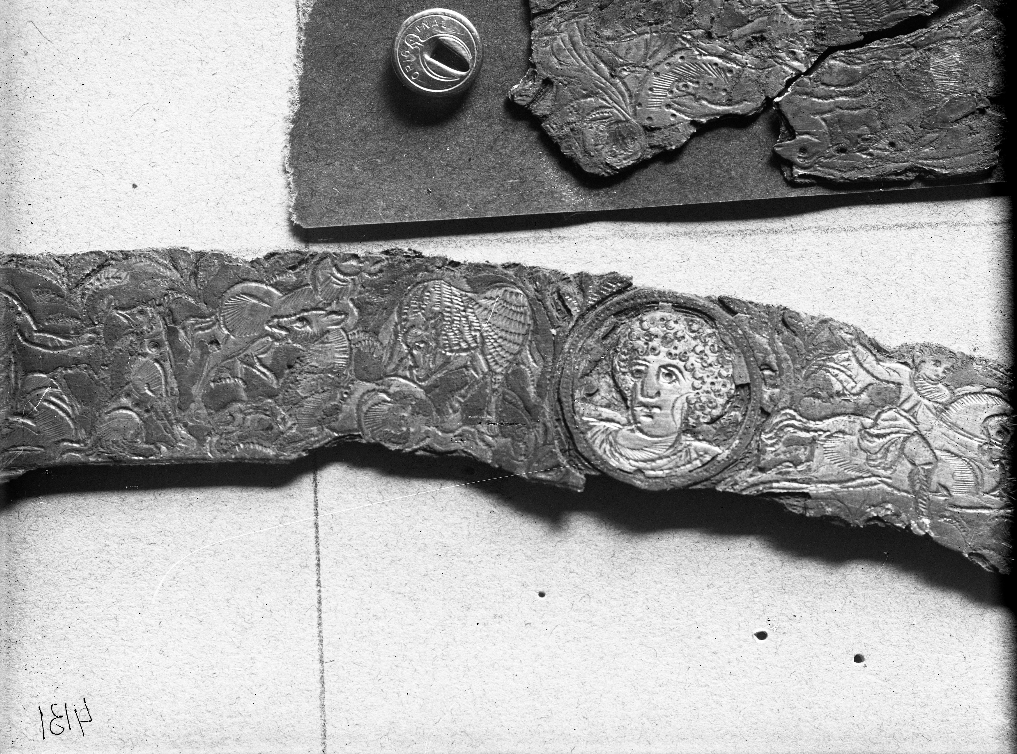 Missorium 1 da Cesena, rinvenimento sul Colle Garampo nel 1948. Particolare della decorazione dell'orlo, prima del restauro