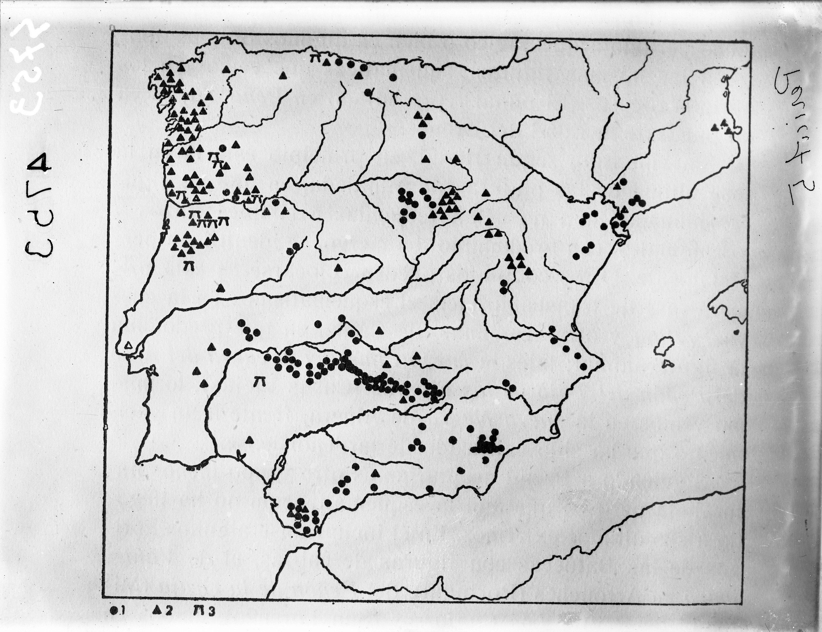 Disegno della Penisola Iberica con siti relativi età del Bronzo (?); da libro a stampa
