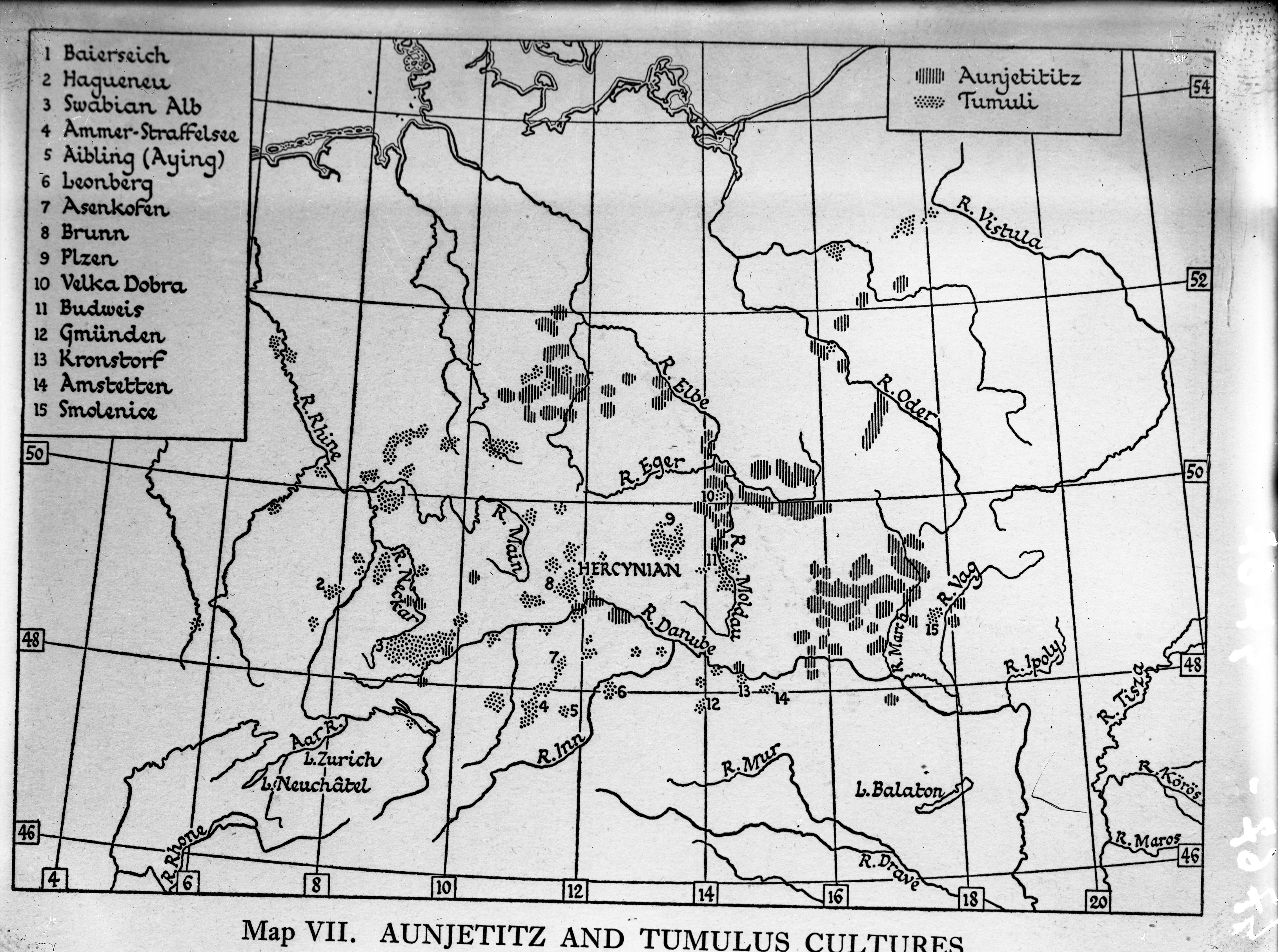 Disegno della Regione danubiana con aree relative alla Cultura dei Tumuli, da libro a stampa di Vere Gordon Childe (?)