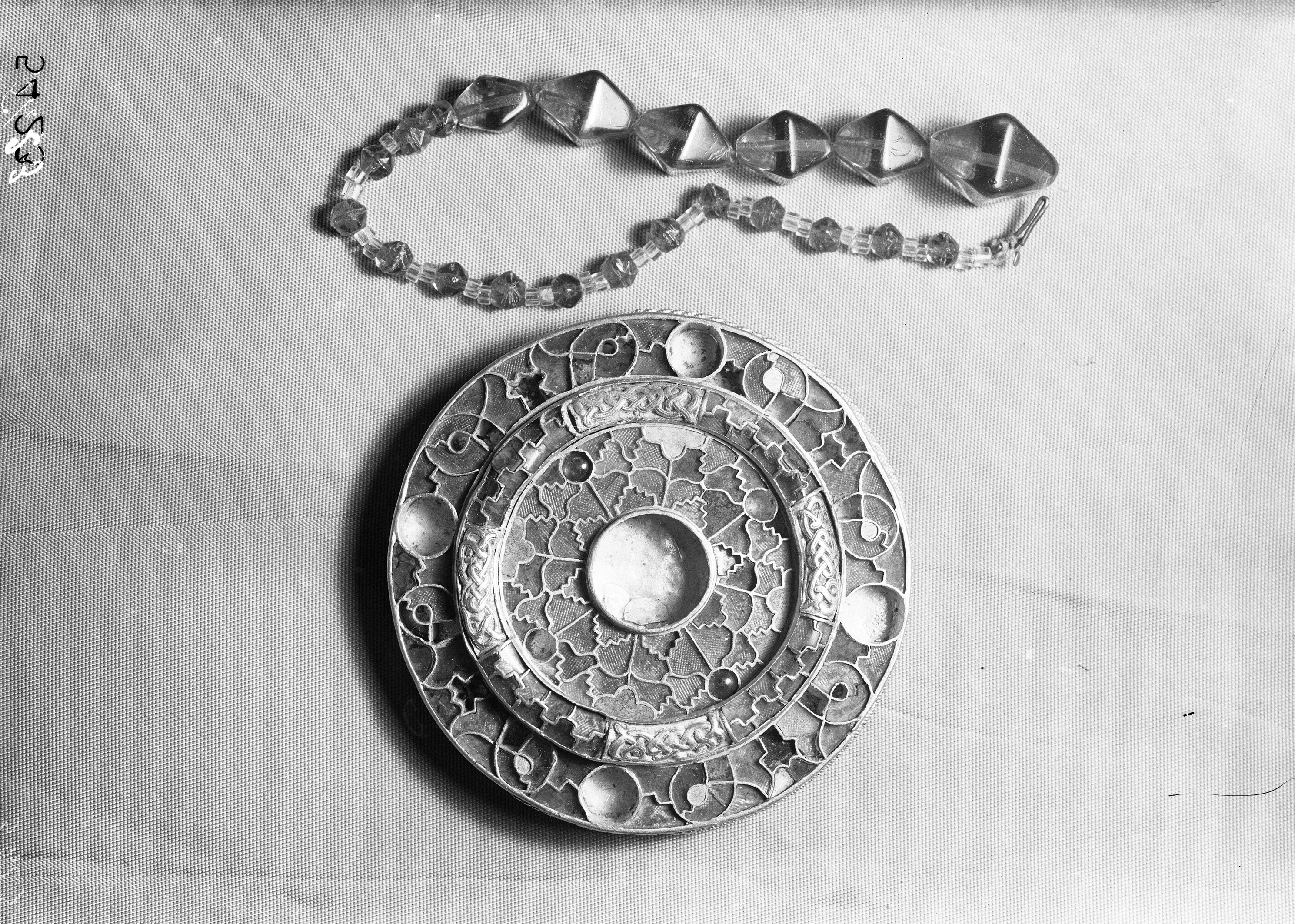 Fibula a disco aureo con decorazione cloisonné, con granati, pietre alamandine e lamine auree, collana in vaghi vitrei; da una sepoltura longobarda di Parma, borgo della Posta. Museo Archeologico di Parma