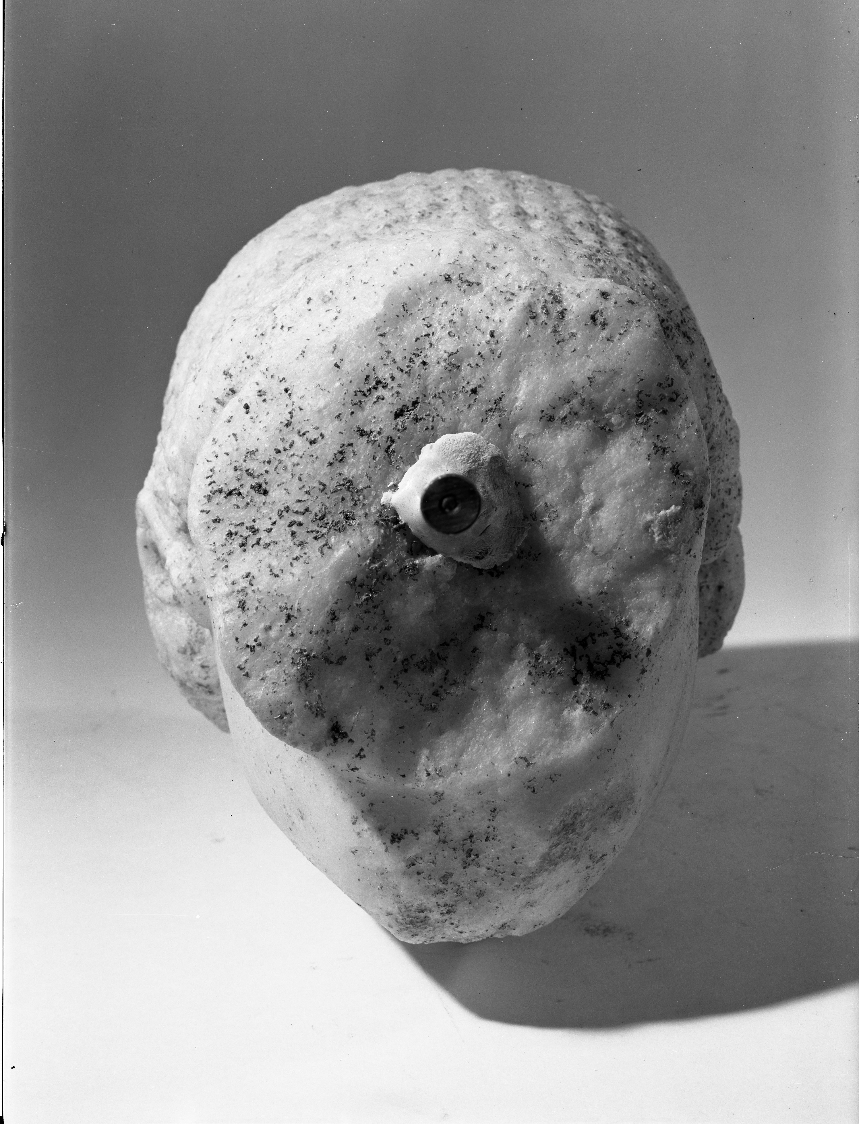 Testa di kouros in marmo, visione della zona inferiore con perno per l'alloggiamento. Da Marzabotto