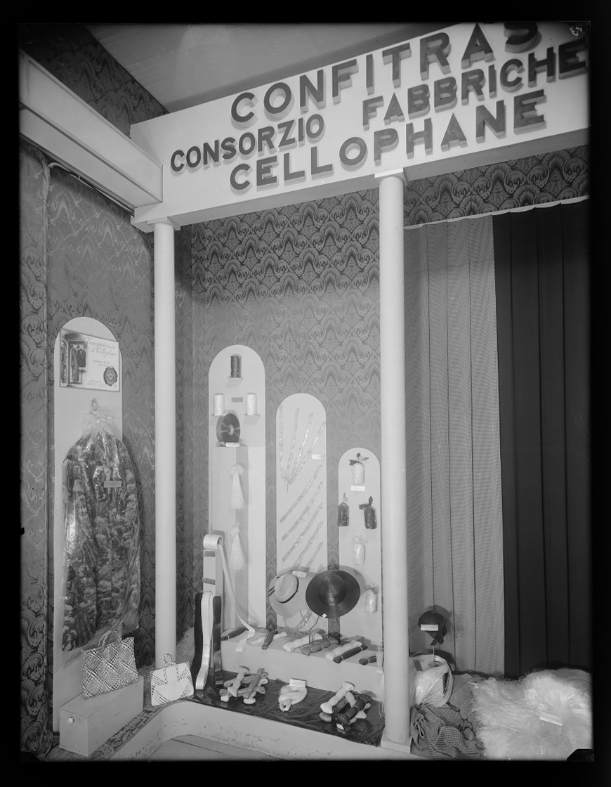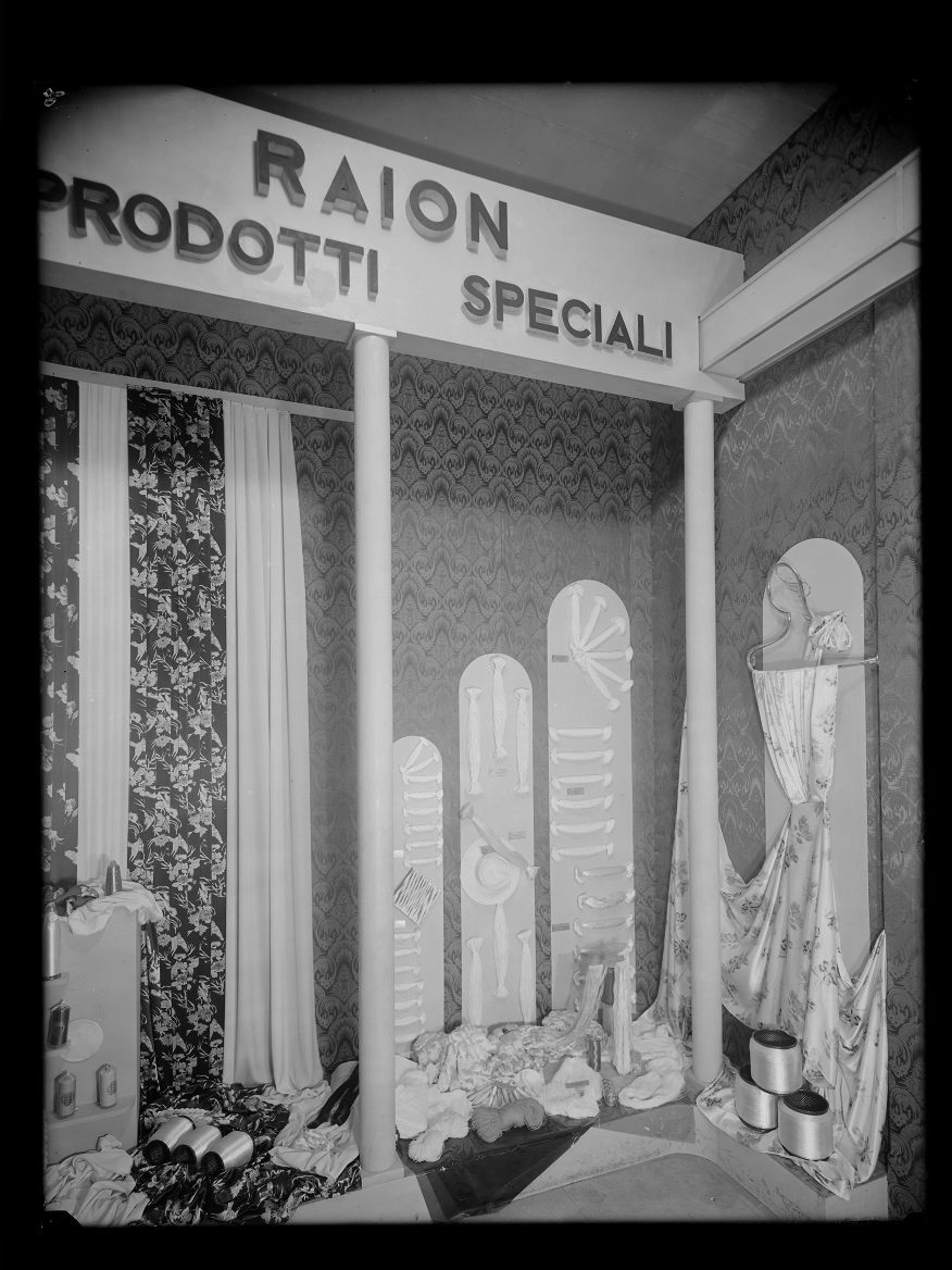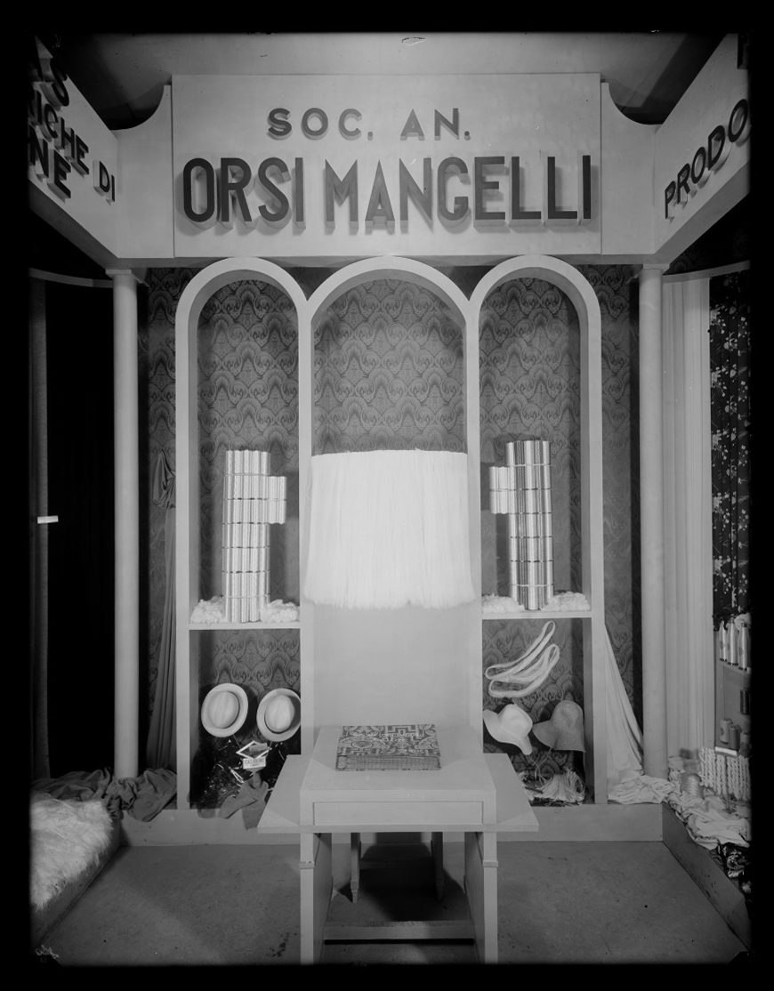 • NOTIZIE STORICO CRITICHE Un filmato dell’Istituto Luce ripreso il 16 dicembre 1936 documenta Achille Starace all’inaugurazione della I Mostra Nazionale delle Fibre Tessili, organizzata presso la Stazione Agraria Sperimentale Arnaldo Mussolini in piazzale della Vittoria a Forlì (video intitolato “Starace inaugura a Forlì la Mostra delle fibre tessili nazionali, accompagnato dai ministri”, canale Youtube dell’Istituto Luce Cinecittà). Il documentario permette di riconoscere l’allestimento fotografato in Z175; al secondo 26’’ della sequenza compare una coppia di fasci littori composti da rocchetti di filato: sono i medesimi della vetrina approntata con produzioni tessili della Società Anonima Orsi Mangelli (S.A.O.M., azienda di filati in seta artificiale con sede a Forlì). Tale legame consente di identificare i 4 negativi contenuti nella Scatola 18_ORSI MANGELLI dell’archivio fotografico Zoli: si tratta di un insieme di immagini dell’esposizione forlivese, realizzate da Edgardo Zoli nel dicembre del 1936 (invv. Z173-176). Le immagini Z174, Z175 e Z176 documentano la stessa sala predisposta con prodotti della ditta Orsi Mangelli e del Consorzio Confitras (Consorzio Fabbriche Italiane di Trasparente: in Z174 sulla sinistra è appeso un abito all’interno del “Transparsacco”, in cellophane brevettato). Il negativo Z173 mostra invece un diverso ambiente; la parete ripresa è dedicata al ciclo produttivo del rayon: sopra l’espositore sono sistemati dapprima i campioni di cellulosa, quindi la viscosa in fase liquida, infine la seta artificiale prodotta, ovvero il rayon (presentato in bobine di filatura, poi in rocchetti di torcitura e da ultimo in matassa). ). A ben guardare le fotografie esposte - inserite in sequenza come parte costitutiva dell’allestimento, sopra e di lato alla teca del rayon - si riconoscono alcune delle riprese effettuate da Zoli all’opificio tessile, in particolare gli interni dello stabilimento con le grandi macchine di produzione. L’immagine Z173 permette infatti di identificare alcuni negativi realizzati da Zoli in precedenza, ovvero nello stesso 1936 presso lo stabilimento industriale (fototipi ugualmente catalogati nel 2021, vedi scheda 0800687876). In conclusione, nel 1936 Edgardo Zoli attese ad un importante lavoro commissionato dalla famiglia Mangelli: dapprima gli fu richiesto di eseguire un servizio fotografico dell’intero complesso produttivo, quindi stampò le immagini scelte da esporre alla mostra, da ultimo andò a fotografare gli allestimenti. Si ricorda infine che la Scatola 18_ORSI MANGELLI è stata estrapolata nell'agosto 2021 all'interno di un primo lotto di catalogazione dell'Archivio fotografico Zoli. Il contenitore era collocato nella sezione “Scaffale misto - Enti privati (Forlì)”, partizione prevalentemente dedicata alle aziende forlivesi fotografate dallo studio Zoli (tale ordinamento è posteriore all'acquisizione del 2019, vedi OSSERVAZIONI)