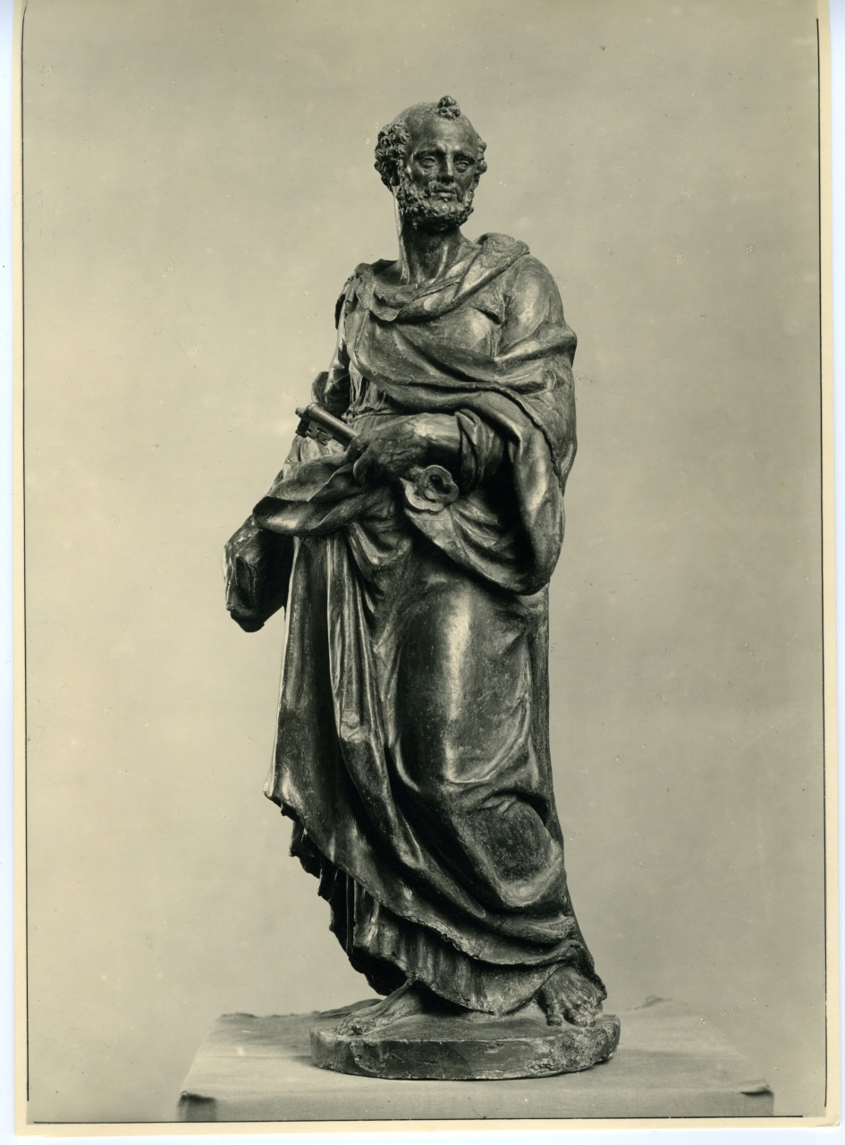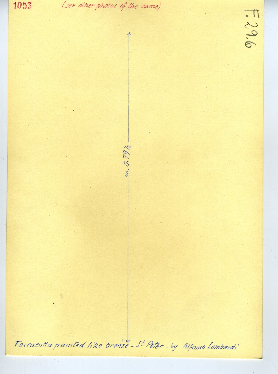 busta telata (cm. 21 x 29), ingiallita e consumata lungo i bordi e agli angoli e con un lembo aperto nella faccia posteriore. Sulla parte anteriore, lungo il bordo superiore, impressa a inchiostro blu in senso opposto la scritta "SCULTURA TERRACOTTA". All'interno, 19 foto di sculture in terracotta