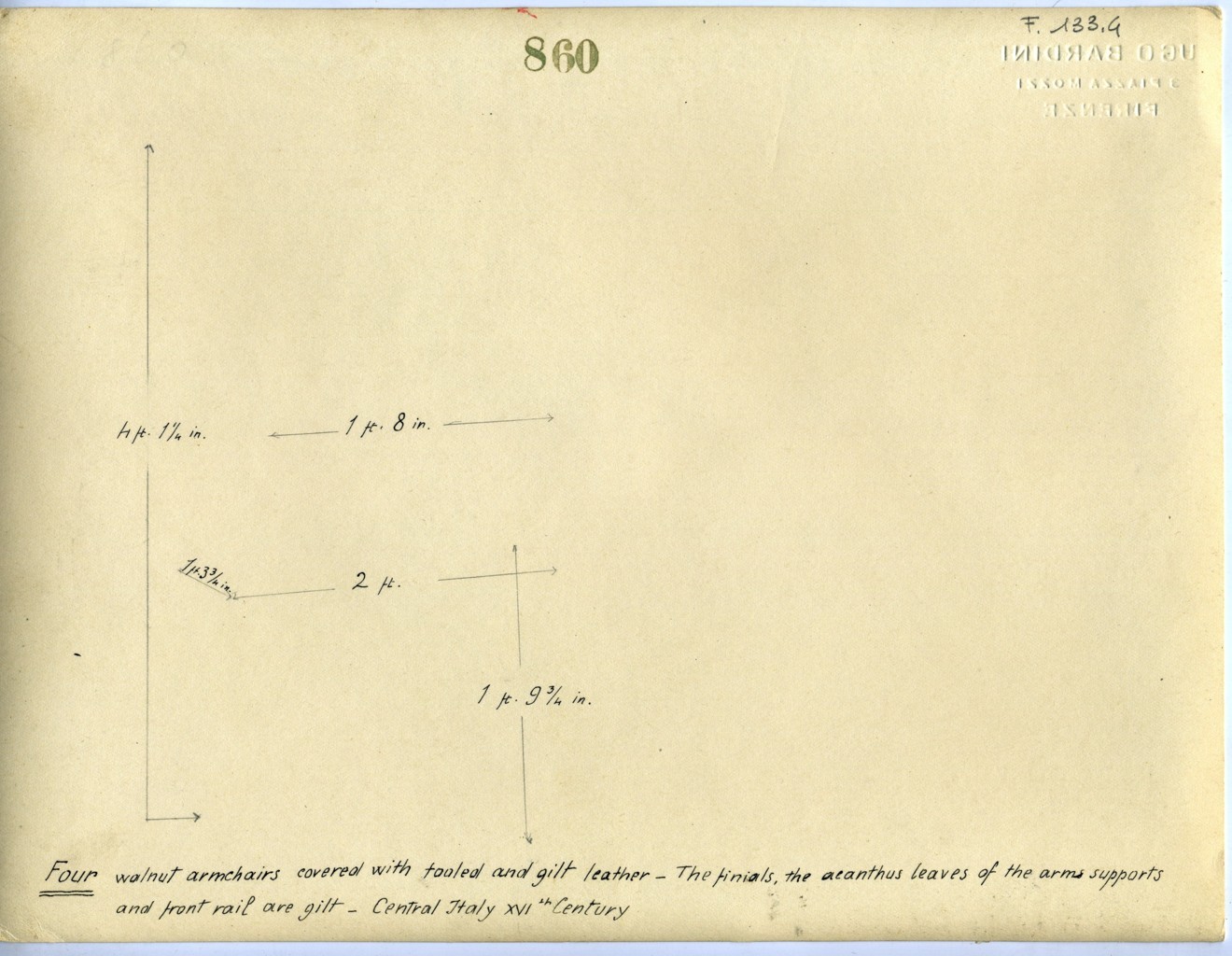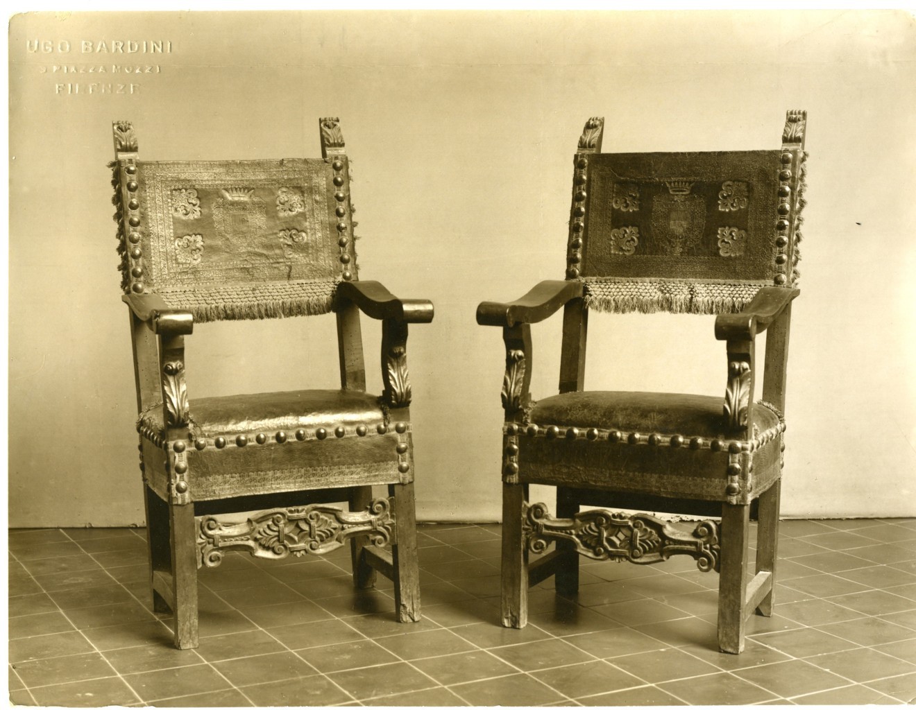 - NOTIZIE STORICO CRITICHE La coppia di seggioloni (inv. Bd nn. 9136, 1170), facente parte dell'Eredità Bardini, era originariamente inserita nell'arredo del salone della villa Bardini. Dall'analisi stilistica si possono datare alla fine del Cinquecento, anche se le dorature, come le parti in cuoio furono quasi sicuramente rinnovate dai Bardini (le decorazioni presentano un repertorio seicentesco). Fra gli oggetti dell'Eredità ci sono giunti, infatti, alcuni dei ferri utilizzati per imprimere il cuoio