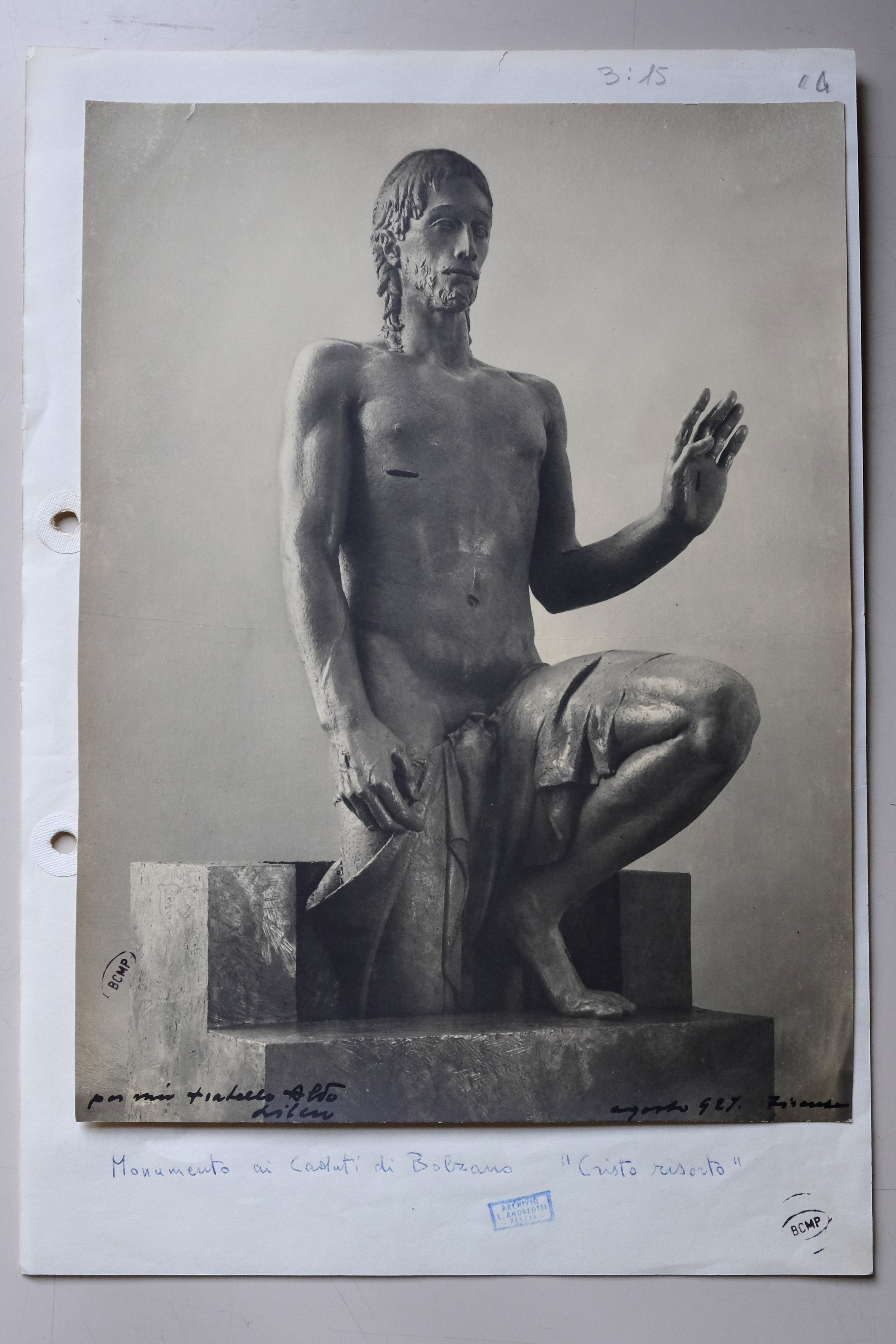 - NOTIZIE STORICO CRITICHE Il positivo in oggetto fa parte delle fotografie conservate nell’Archivio Libero Andreotti che documentano l’intensa attività dell’artista, tra il 1921 e il 1928, intorno alla realizzazione di monumenti celebrativi ai caduti della Prima Guerra Mondiale. La serie di commissioni pubbliche che vedrà impegnato Andreotti in questo periodo costituisce una svolta stilistica netta rispetto al passato, cimentandosi in un genere mai sperimentato prima. La fotografia rappresenta la scultura principale per il Monumento alla Vittoria Italiana di Bolzano. Il monumento, costituito da uno spazio architettonico in forma di arco trionfale commissionato all’architetto Marcello Piacentini nel 1926, fu inaugurato il 13 luglio 1928. L’opera scultorea di Libero Andreotti, realizzata in bronzo, si inserisce al centro dell’architettura ed è costituita dalla figura monumentale del Cristo risorto che si innalza dal sepolcro. Sulla parte posteriore dell’altare è realizzato un bassorilievo, anch’esso in bronzo, raffigurante “La Vittoria che incita e la Vittoria che consola”. Il progetto iniziale prevedeva anche la presenza di statue raffiguranti le virtù che non vennero mai realizzate, di cui rimangono i bozzetti in gesso. Libero Andreotti nasce a Pescia il 15 giugno 1875. Nel 1892 si trasferisce a Lucca con la famiglia, città che costituirà un punto di riferimento anche negli anni successivi e dove avrà i suoi primi contatti con ambienti artistici e politici. Nel corso del 1897 giunge a Palermo e qui inizia a scrivere per il settimanale palermitano La Battaglia per il quale lavorerà, nella veste di illustratore con lo pseudonimo di Turop, fino al 1899, quando lascerà provvisoriamente Palermo per tornare a Lucca. Nel 1900 arriva a Firenze e inizia la sua amicizia con il pittore e disegnatore Enrico Sacchetti suo futuro biografo con cui dal 1901 condividerà uno studio in via Nazionale. A Firenze continua a lavorare come disegnatore, ma al tempo si dedica più intensamente alla professione di pittore, riuscendo ad essere ammesso alla scuola del Nudo dell'Accademia. Dal 1904 frequenta lo studio di Mario Galli dove scopre quasi per caso la scultura. Dal 1909 si trasferisce a Parigi dove rimarrà fino allo scoppio della guerra; qui frequenterà assiduamente il mondo artistico e mondano parigino ed otterrà il riconoscimento ufficiale per la sua opera scultorea esponendo in ambienti e gallerie di rilievo nella città. Costretto a rientrare in Toscana continuerà i suoi approfondimenti artistici e le sue attività scultoree; alla fine del 1914 diventa assistente di Domenico Trentacoste all'Accademia di Firenze. Nel 1917 parteciperà in prima persona alla guerra ed in questo momento l'attività artistica si ridurrà a veloci ed acuti appunti grafici, eseguiti dal vero, ma nonostante la guerra la stima nei confronti della sua opera crescerà sempre più. In questo periodo il principale referente di Andreotti sarà Ugo Ojetti. Nel 1920 Andreotti ottiene la cattedra di scultura decorativa presso l'Istituto d'arte di Firenze. Il 1921 è un anno significativo. A gennaio allestisce una personale alla galleria di Lino Pesaro a Milano e in questa occasione ritrova il pittore Aldo Carpi con cui avrà un profondo legame affettivo e di comunione intellettuale che lo aiuterà a superare un periodo di profonda inquietudine interiore. Nel 1922 Andreotti sposerà Margherita, sorella del pittore lombardo, con la quale si traferirà stabilmente a Firenze. Nel 1923 inizia la stagione dei grandi impegni celebrativi: completa il monumento ai Caduti di Roncade, cominciato l'anno precedente, ed esegue i gessi per il monumento ai Caduti di Saronno. In quell'anno viene bandito il concorso per il gruppo in marmo della Madre Italiana da porsi a Firenze in Santa Croce di cui risulterà il vincitore. Inizia anche il lavori per il monumento alla vittoria di Bolzano che verrà inaugurato nel 1928, e per il monumento ai Caduti di Milano, intorno al quale inizieranno delle discussioni che si protrarranno fino al 1930. Negli ultimi anni della sua vita Andreotti restituisce una dimensione privata al proprio lavoro e si dedica prevalentemente al ritratto. In questo periodo l'artista è molto impegnato nel ruolo di docente presso l'Istituto d'Arte. Il 4 aprile del 1933 muore a Firenze e viene sepolto al cimitero delle Porte Sante di San Miniato al Monte; sulla sua tomba viene collocata una fusione del Cristo Risorto da lui realizzata per il monumento di Bolzano