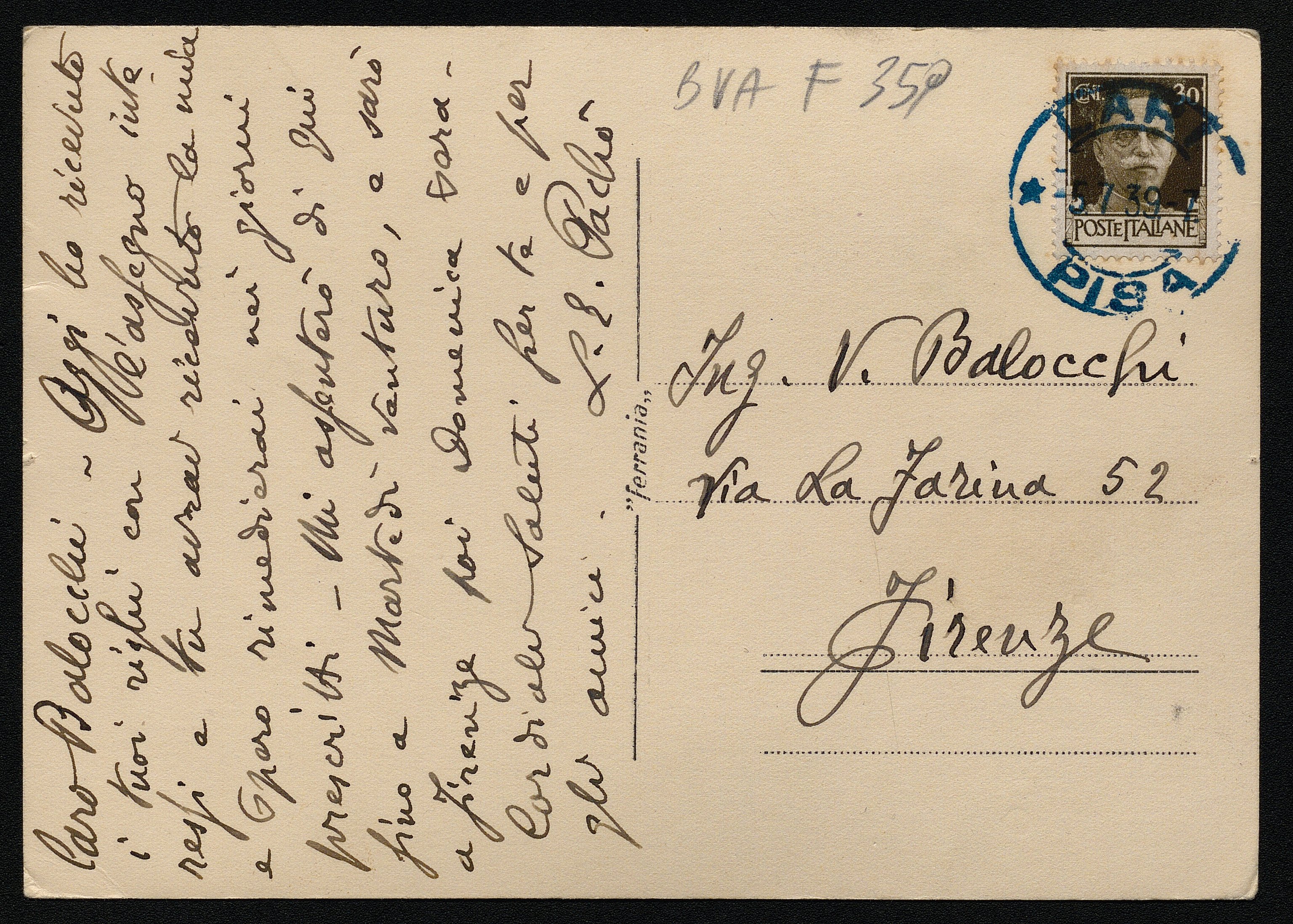 Paesaggio toscano. Cartolina inviata dall'autore a Vincenzo Balocchi