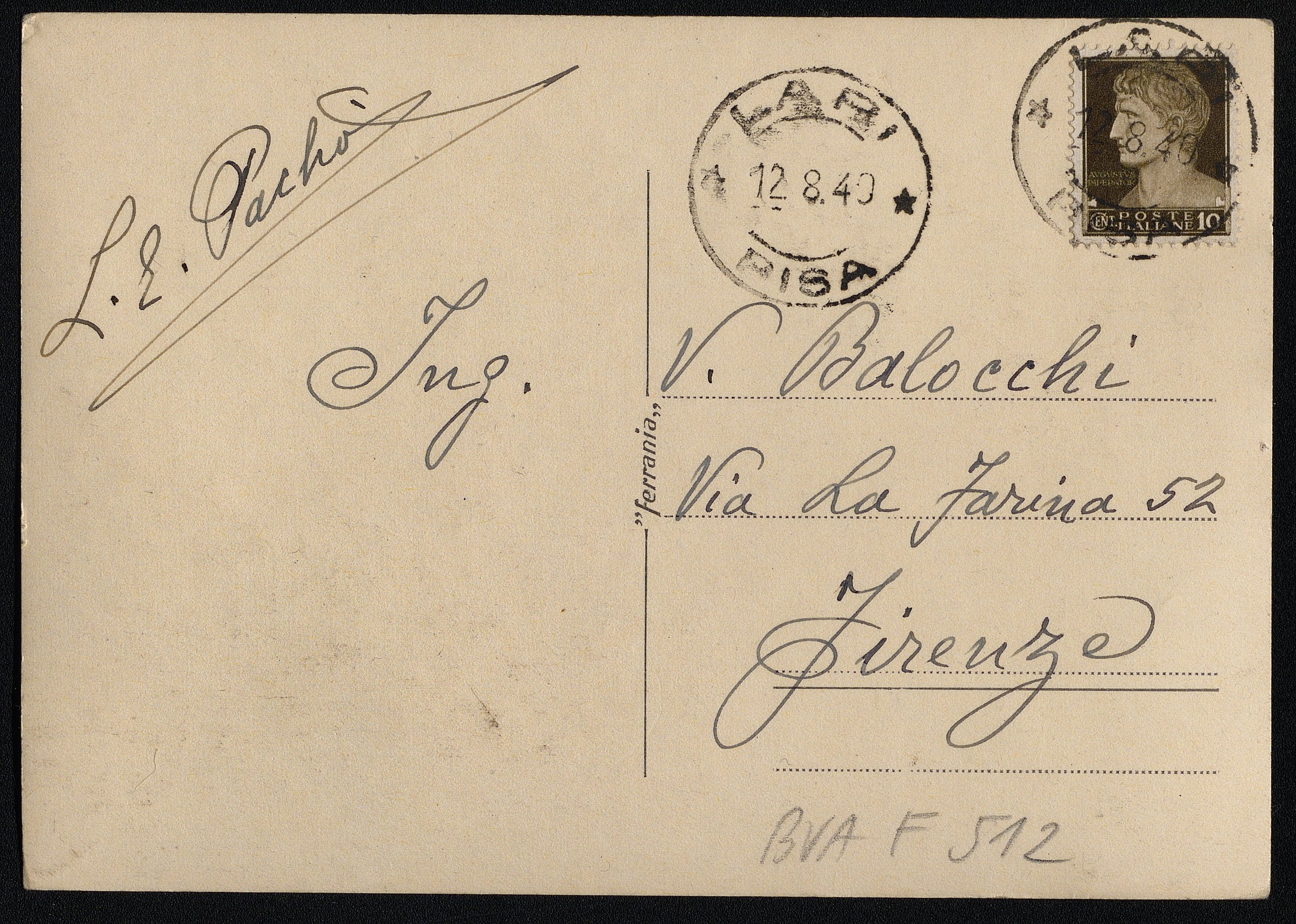 Ritratto di gatto bianco. Cartolina inviata dall'autore a Vincenzo Balocchi