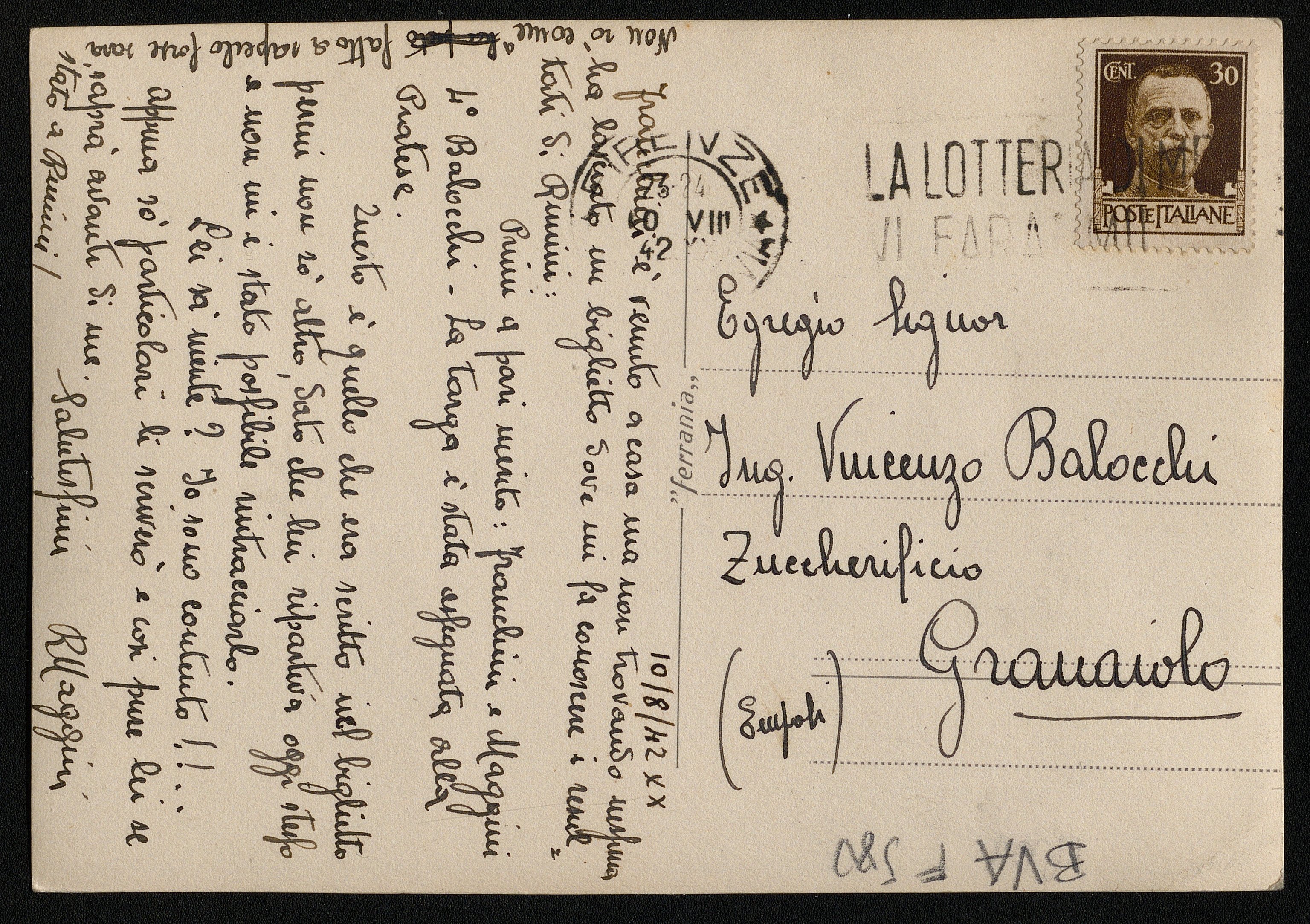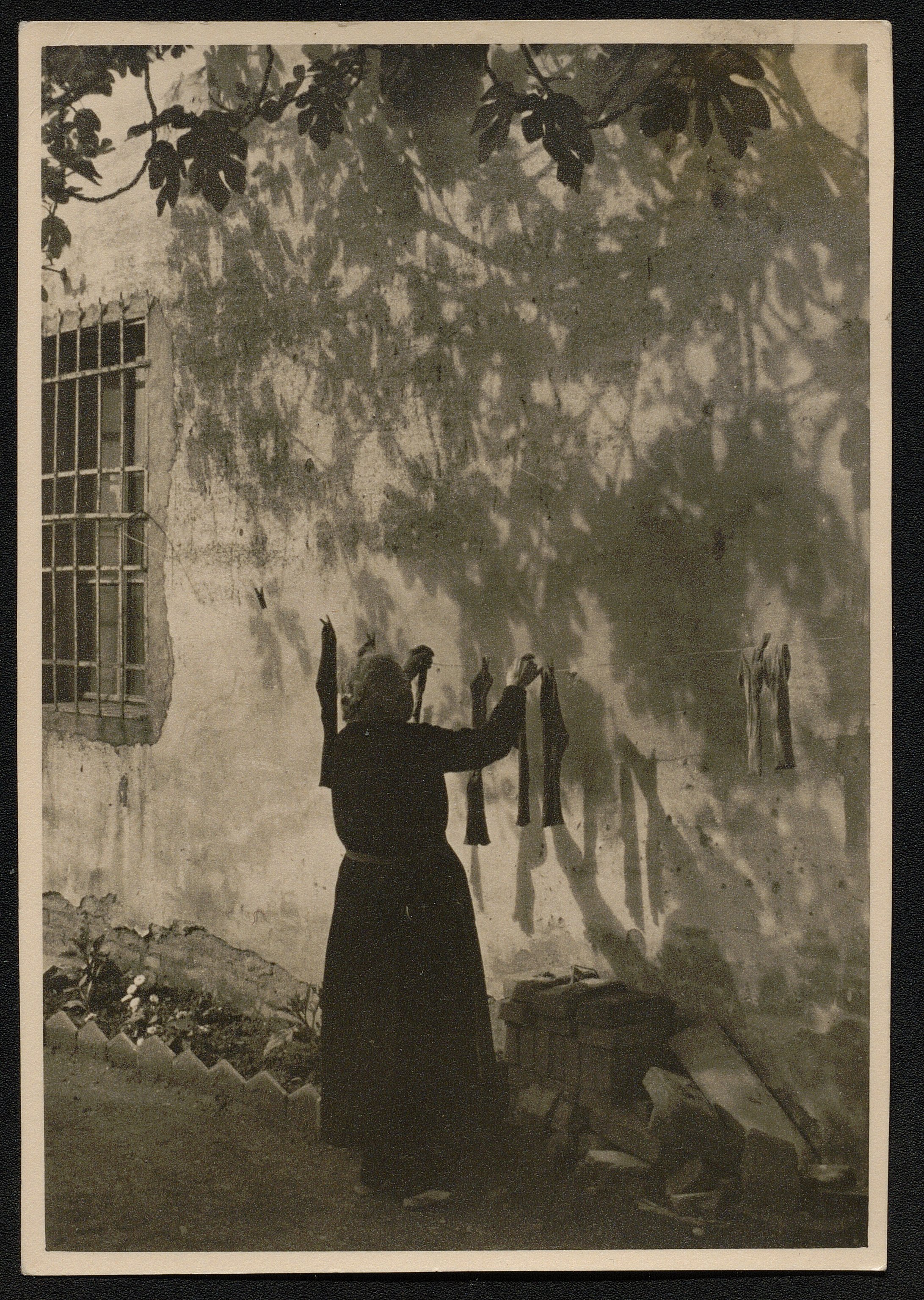 Anziana che stende i panni. Cartolina inviata dall'autore a Vincenzo Balocchi