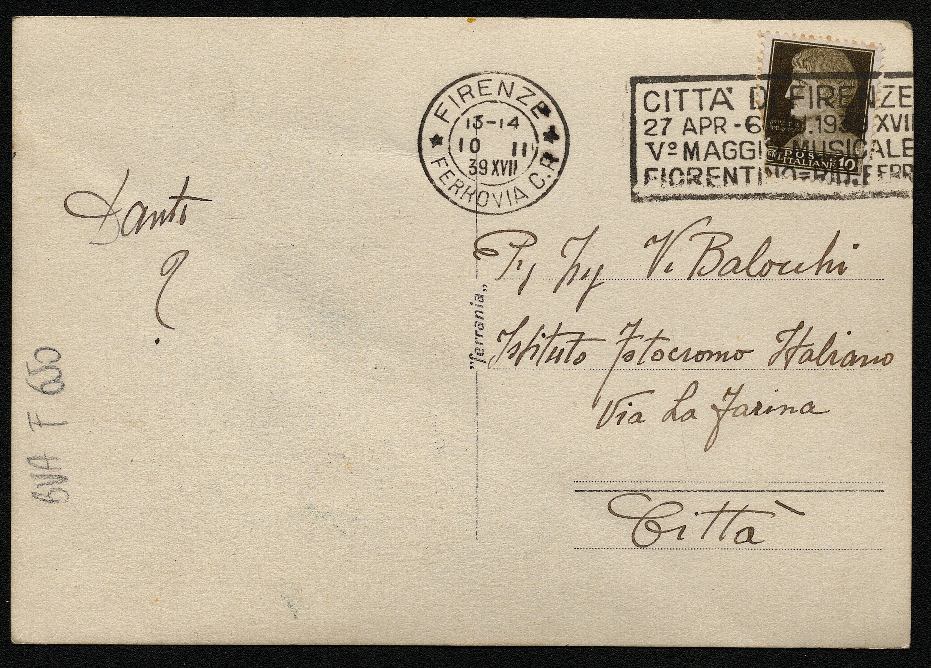 Carrozza con cavalli. Cartolina inviata dall'autore a Vincenzo Balocchi
