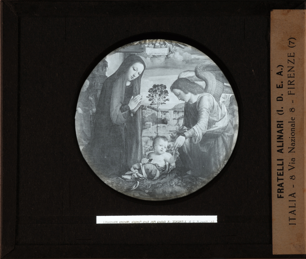 La maschera di cartoncino interna è sagomata in modo da isolare l'opera, che è di formato tondo, e la didascalia editoriale Alinari