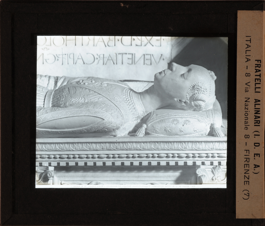 - ISCRIZIONI sul supporto primario: in basso al centro - (Ed. ne Alinari) P.e I.a N.° 15296. BERGAMO - Cappella Colleoni. Dettaglio del monumento a Medea Colleoni. (G.A. Amadei.) - a penna -