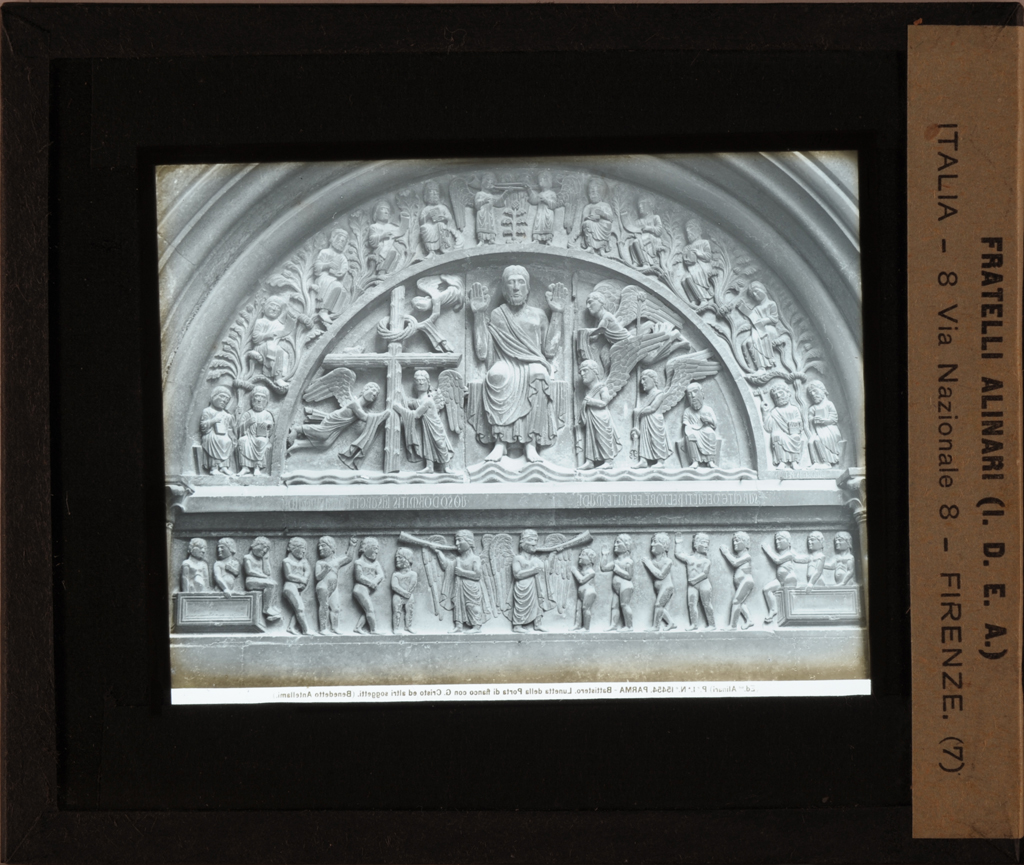 - ISCRIZIONI sul supporto primario: in basso al centro - (Ed. ne Alinari) P.e 2.a N.° 15454. PARMA - Battistero. Lunetta della Porta di fianco con G. Cristo ed altri soggetti. (Benedetto Antellami.) - a penna -