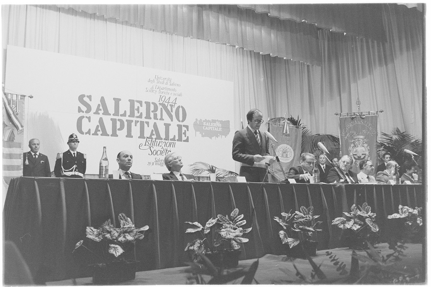 - NOTIZIE STORICO CRITICHE Nel 1984, Salerno si apprestava a ricordare e festeggiare il 40esimo anniversario da “Salerno Capitale”. Per l’occasione venne richiesto al presidente della Repubblica, Sandro Pertini, di poter inaugurare il convegno di studi sul 1944. Il 29 maggio, il Presidente giunse a Salerno dove ricevette un vero bagno di folla fino al Teatro Augusteo. Pertini, per l’intero corteo, stette in piedi nell’Alfa presidenziale, salutando la folla che gridava il suo nome. Dopo il convegno, venne accolto al comune dove il sindaco gli offrì una targa d’argento (un grosso piatto, sul quale era stato effigiato il suo volto, venne donato da una cooperativa di ceramisti). Nel salone dei marmi, seguì un piccolo discorso tenuto dal Presidente che ricordò, ai tempi di Salerno Capitale, la sua presenza «in quella parte d’Italia non ancora liberata, in montagna». Pertini ricordò la sua evasione, insieme al futuro presidente Giuseppe Saragat, dal carcere Regina Coeli; evasione ottenuta, principalmente, grazie al Gracceva e Vassalli. Commovente fu l’incontro con un suo vecchio commilitone, Antero Mercurio di Casalbuono (tre volte medagliato e “cavaliere di Vittorio Veneto”), con lui in trincea durante gli anni della Grande Guerra