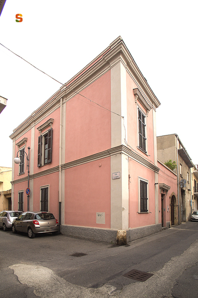 palazzetto a due piani e in posizione d'angolo, su un lotto di circa 15 per 11 metri. Il fabbricato principale ha pianta rettangolare di circa 15 per 6 metri occupa il lato NO del lotto e presenta i prospetti su strada divisi a campate uguali da lesene piatte in rilievo, interrotte dalla fascia marcapiano modanata e concluse in sommità da un cornicione di coronamento modanato. Le aperture sono rettangolari con cornice modanata in rilievo e quelle del primo piano sono sormontate da un timpano rettilineo modanato. Il prospetto sulla via principale prosegue con un muro su cui si apre un piccolo ingresso rettangolare sormontato da un timpano rettilineo sorretto da mensole decorate e l'ampio portale a tutto sesto con stipiti e ghiera in mattoni laterizi a vista. L'edificio ha basamento in pietrame, murature in ladiri intonacate e rinforzate da mattoni laterizi o conci in calcare nelle parti speciali. La copertura è a falde e il tetto a tegole.