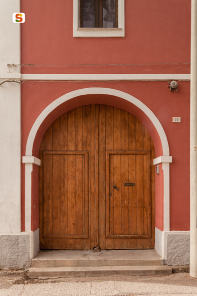ubicato nel centro di San Gavino Monreale, il bene è uno dei portali storici del paese. Si tratta di un portale ligneo a doppia anta a protezione di un'apertura ad arco a tutto sesto inserito in un edificio abitativo sviluppato su due livelli interamente intonacati e tinteggiati. Il profilo dell'arco e dei piedritti è evidenziato una linea bianca a contrasto sullo sfondo colorato. Il portale ha una struttura in doghe verticali accostate, montate su un telaio interno e presenta superfici trattate. Delle cornici in rilievo delimitano il profilo di due rettangoli, uno dei quali apribile e destinato ad ingresso pedonale. Il portale si affaccia su strada per un'altezza di 3,16 metri per 2,56 di larghezza.
