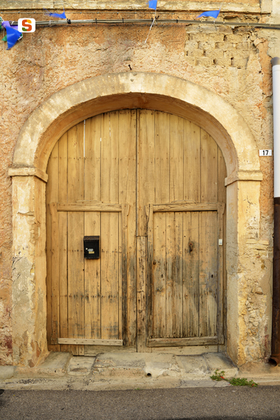 portale ligneo a doppia anta inscritto in un arco a tre centri. L'imbotte intonacato, è costituito da un doppio paramento di mattoncini pieni intonacati, costruiti su due spessi monoliti. Il portale ha una struttura a doghe accostate, montate su un telaio interno; presenta superfici con cornici rettangolari in rilievo che delimitano il profilo di due ingressi pedonali. Il rinfianco è in blocchi di fango e paglia (làdiri). Il portale si affaccia su strada per 3,50 metri d'altezza per 2,60 di larghezza. Continua in OSS.
