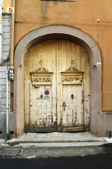 portale ligneo a doppia anta inscritto in un arco a tre centri. L'imbotte è costituito da robusti conci di pietra per la ghiera e da monoliti con sguincio per i piedritti. Il portale tinteggiato ha una struttura a doghe accostate montate su un telaio interno; presenta lisce superfici con cornici modanate in aggetto che delimitano il profilo di due ingressi pedonali, sopra cui campeggiano due lettere in aggetto. Altre decorative incisioni in rilievo richiamano motivi fitomorfi. Il portale si affaccia su strada per un altezza di 4 metri ed una larghezza di 3. Continua in Oss.