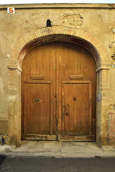 portale ligneo a doppia anta inscritto in un arco a tre centri. L'imbotte è costituito da un doppio paramento di mattoncini pieni a vista disposti alternativamente a fascia e a punta a corsi sfalsati, costruiti su due spessi monoliti. Il portale ha una struttura a doghe accostate, montate su un telaio interno; presenta superfici lisce da cui risaltano due cornici di doghe che circoscrivono i bordi di un doppio ingresso pedonale rettangolare. Decorative modanature in rilievo sono presenti in corrispondenza degli ingressi. Il portale si affaccia su strada con 3,80 metri di altezza per 2,80 di larghezza. Continua in OSS.