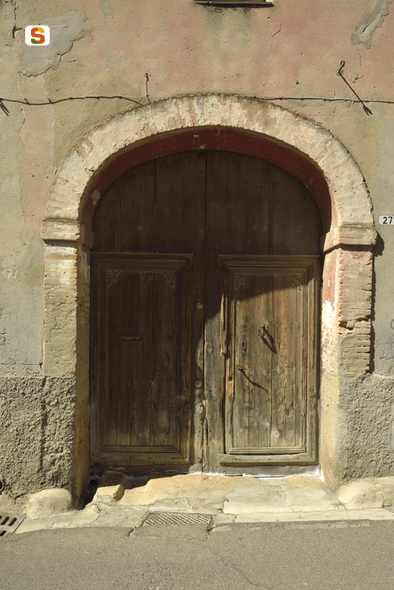portale ligneo a doppia anta inscritto in un arco policentrico. L'imbotte è costituito da un doppio paramento di mattoncini pieni a vista disposti alternativamente a fascia e a punta a corsi sfalsati, costruiti su due spessi monoliti. Il portale ha una struttura a doghe accostate, montate su un telaio interno; presenta superfici lisce da cui risaltano due cornici di doghe che circoscrivono i bordi di un doppio ingresso pedonale rettangolare. Decorative ghirlande angolari risaltano entro le modanature in rilievo che circoscrivono i due ingressi pedonali. Il portale si affaccia su strada con 3 metri di altezza per 2,30 di larghezza. Continua in OSS.