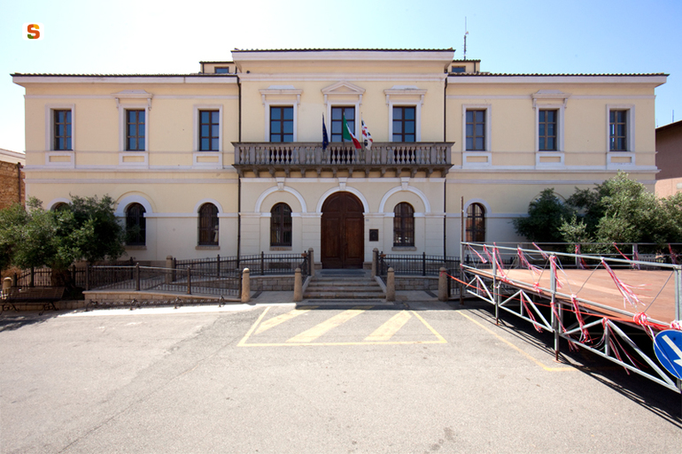 l’edificio, un palazzo comunale costruito alla fine del 1800 come sede della Regia caserma dei Carabinieri, simile alle architetture sarde del periodo, si sviluppa su due piani fuori terra e uno seminterrato, con un’altezza complessiva di circa 10 metri. Risulta compreso in un rettangolo di circa 32 per 22 metri organizzato con una maglia muraria disposta simmetricamente rispetto all'ingresso centrale preceduto da una scalinata in granito. La facciata è tripartita con il corpo centrale leggermente avanzato. Le aperture sono disposte simmetricamente rispetto all'asse centrale. Il portale d'ingresso ha una geometria ad arco a tutto sesto così come le finestre al piano terra, mentre quelle al primo piano presentano un architrave lapideo. Orizzontalmente è diviso da marcapiani modanati e squadrati, il coronamento è modanato. La struttura portante è costituita da muratura in granito e mattoni in terra cruda, intonacati. La copertura è a padiglione con manto di tegole in laterizio.