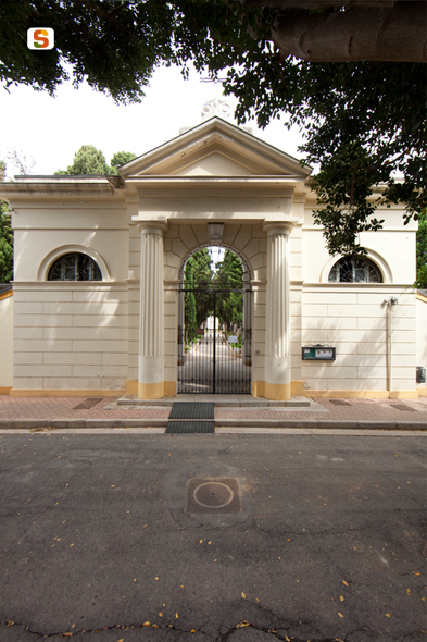 impianto del cimitero risalente alla fine del 1800, di pianta rettangolare avente dimensioni circa 49 per 81 m, simile alle architetture sarde del periodo presenta un unico ingresso sul piazzale antistante. L’edificio di ingresso ad un solo piano fuori terra è tripartito in un corpo centrale e due laterali. Il corpo centrale presenta un’antistante struttura caratterizzata da due colonne scanalate e capitelli dorici, trabeazione e frontone modanati, e un’altezza massima di circa 8 m. Al di sotto si trova l’ossario accessibile da una botola nel pavimento. Il cancello e la croce sovrastante l’ingresso, sono quelli originari in ferro lavorato. I due corpi laterali sono adibiti a funzioni cimiteriali con aperture nella parte alta a mezzaluna, presentano un’altezza di circa 7 m. Una cornice modanata corona tutto il fabbricato. Il recinto è continuo e non presenta scansioni verticali. Le strutture verticali sono in muratura portante, la copertura è a falde inclinate senza rivestimento.