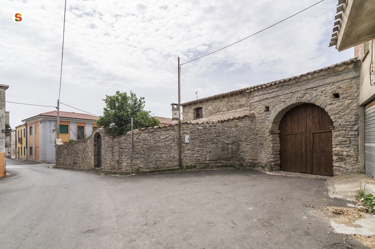 l’edificio, una grande casa padronale edificata nel XIX sec., si sviluppa all’interno di un lotto poligonale affacciato su tre vie. Il fabbricato segue il perimetro del lotto, e si sviluppa entro un recinto in pietra di lunghezza pari a 18 m. Il prospetto è caratterizzato da una muratura continua con paramento murario a vista e ingresso pedonale ad arco. Lateralmente si trova il portale di accesso alla corte retrostante anch’esso in pietra, con copertura a doppia falda con rivestimento di coppi. La facciata è caratterizzata da piccole aperture. La struttura è in muratura portante di pietra locale, gli infissi sono in legno e la copertura è a doppia falda rivestita da tegole curve.