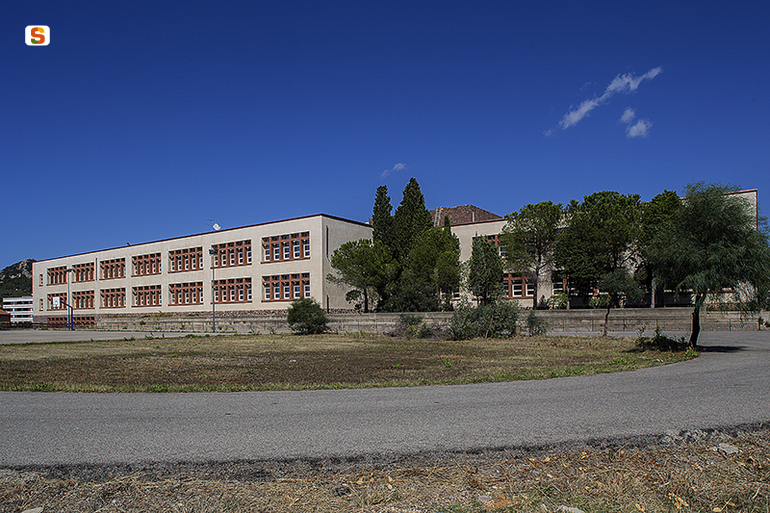 l'edificio, che occupa un lotto di circa 15000 mq., presenta uno schema planimetrico "a pettine" traslato, che include i tre corpi di fabbrica, due destinati alle aule e uno al refettorio, collegati tra loro e imperniati su un corpo centrale destinato a spazio per l'ingresso e i collegamenti verticali. La porzione basamentale dei diversi blocchi risulta accomunata dall’impiego di una alta zoccolatura realizzata in muratura a vista con paramento bugnato in trachite rossa, materiale locale ampiamente impiegato nella edificazione di Carbonia, sulla quale poggiano i due sovrastanti livelli adibiti alla didattica, risolti da una ordinata scansione di aperture rettangolari, su un paramento continuo in muratura intonacata con finitura liscia. Il complesso delle vetrate risulta incorniciato da esili elementi in cemento armato, aventi funzione di schermatura della radiazione solare diretta. Il blocco scale, posto in posizione di cerniera, rispetto all’insieme dei blocchi, (segue in OSS)